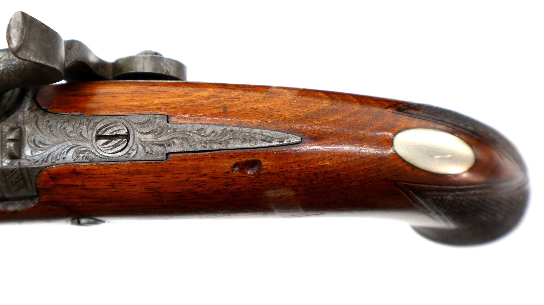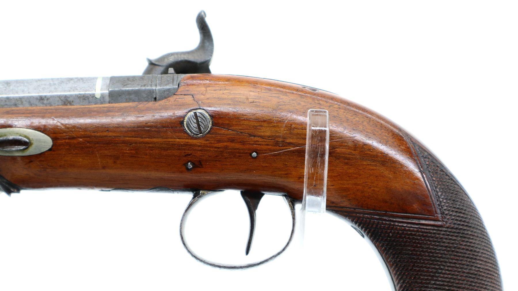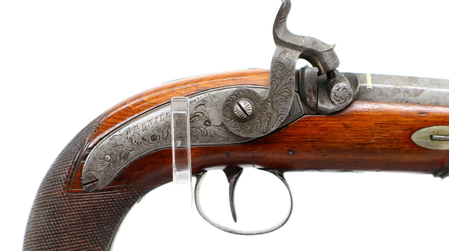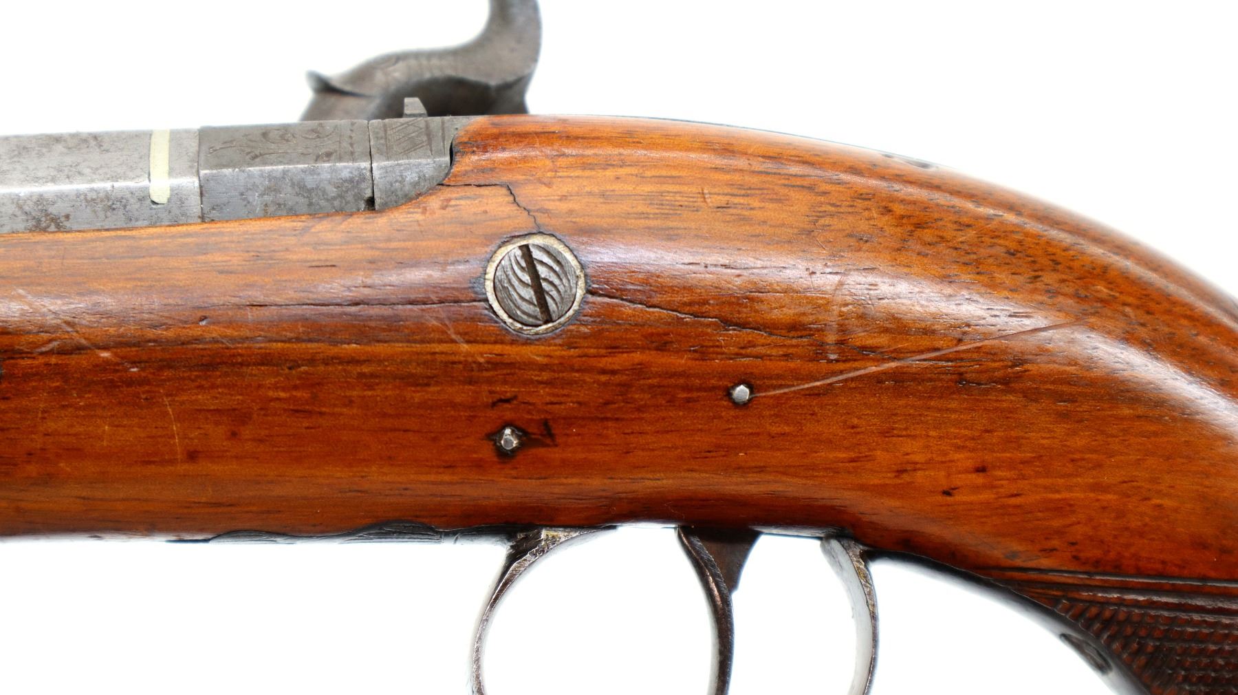 Main Description: Silver bead, Damascus octagon barrel with engraved breech plug and tang, engraved back action lock and checkered spur hammer that functions, nipple is intact. One piece wood grip, single forearm wedge, cracked behind barrel, checkered pistol grip with vanity plate, engraved steel trigger guard, wood ramrod with brass tip.