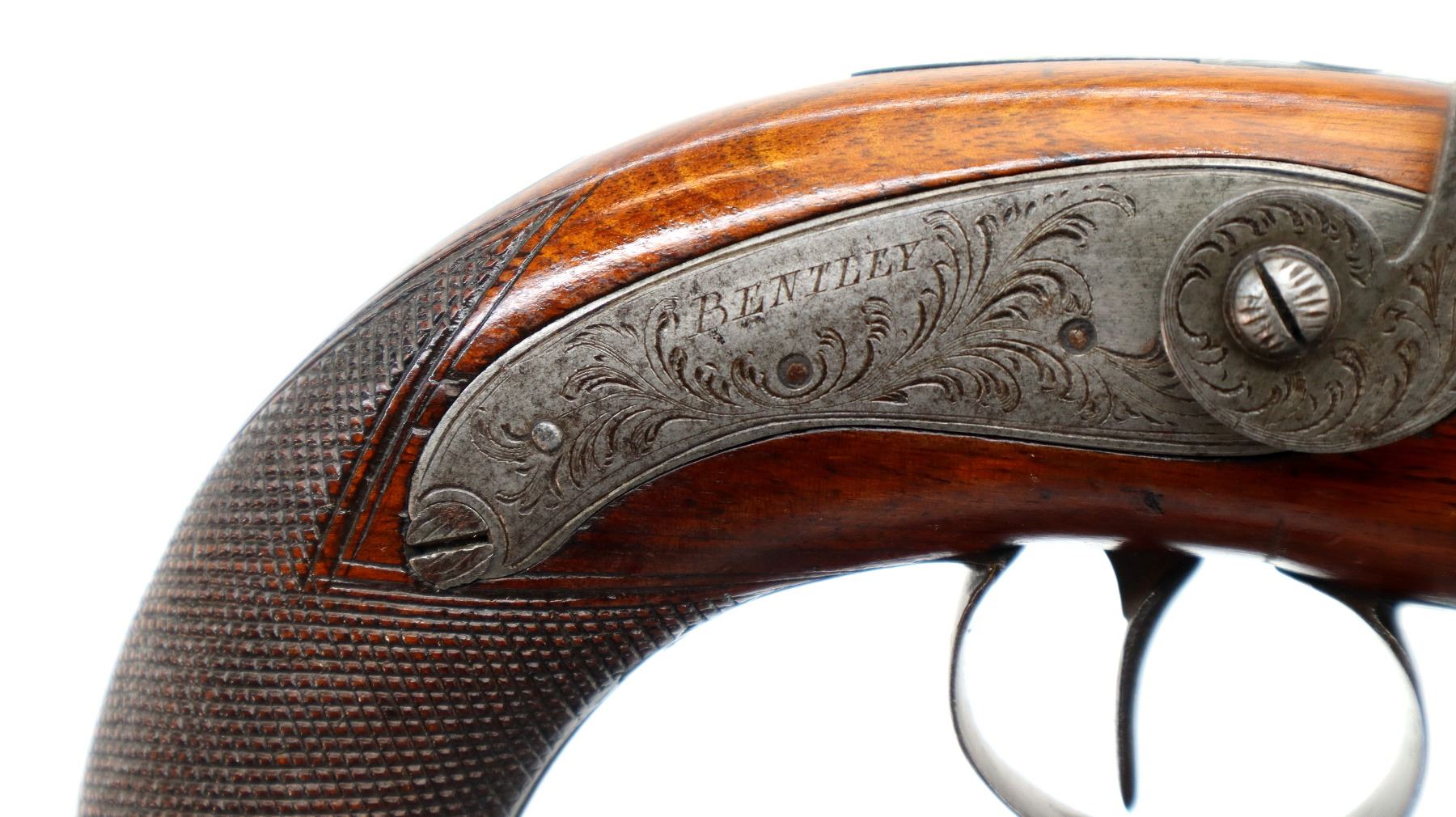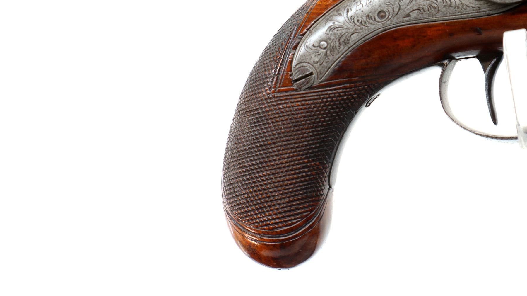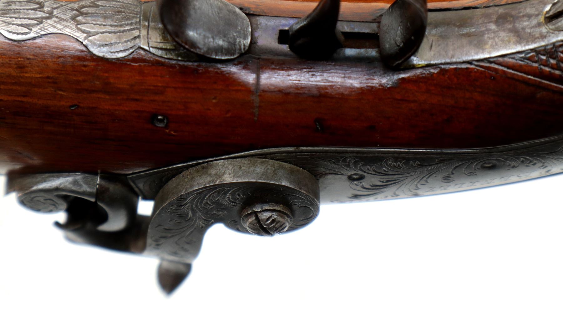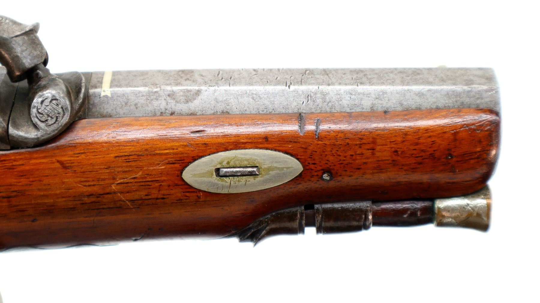 Main Description: Silver bead, Damascus octagon barrel with engraved breech plug and tang, engraved back action lock and checkered spur hammer that functions, nipple is intact. One piece wood grip, single forearm wedge, cracked behind barrel, checkered pistol grip with vanity plate, engraved steel trigger guard, wood ramrod with brass tip.