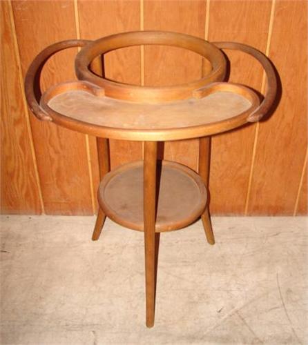 BENTWOOD WASHSTAND. Has soap tray at front with towel racks at sides and bottom shelf. Marked on bottom with label that reads “Fischel/Wien & Niemes i.B.” Takes a 13.25” Dia. washbowl. 31.5” H, 25.75” W, 21.75” D