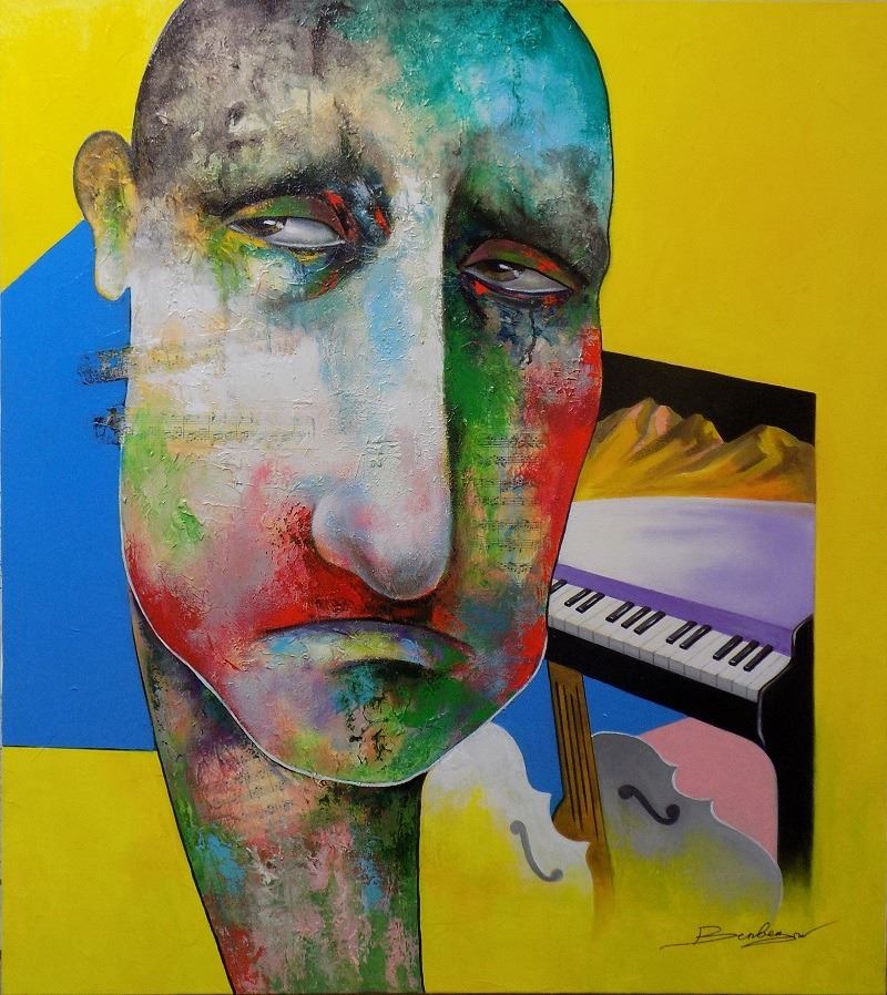 One BERBERYAN Mind of the Musician . Original Mixed Media on Canvas . Height is 36 inches. Width is 32 inches. The shipping charge for this item is $45.