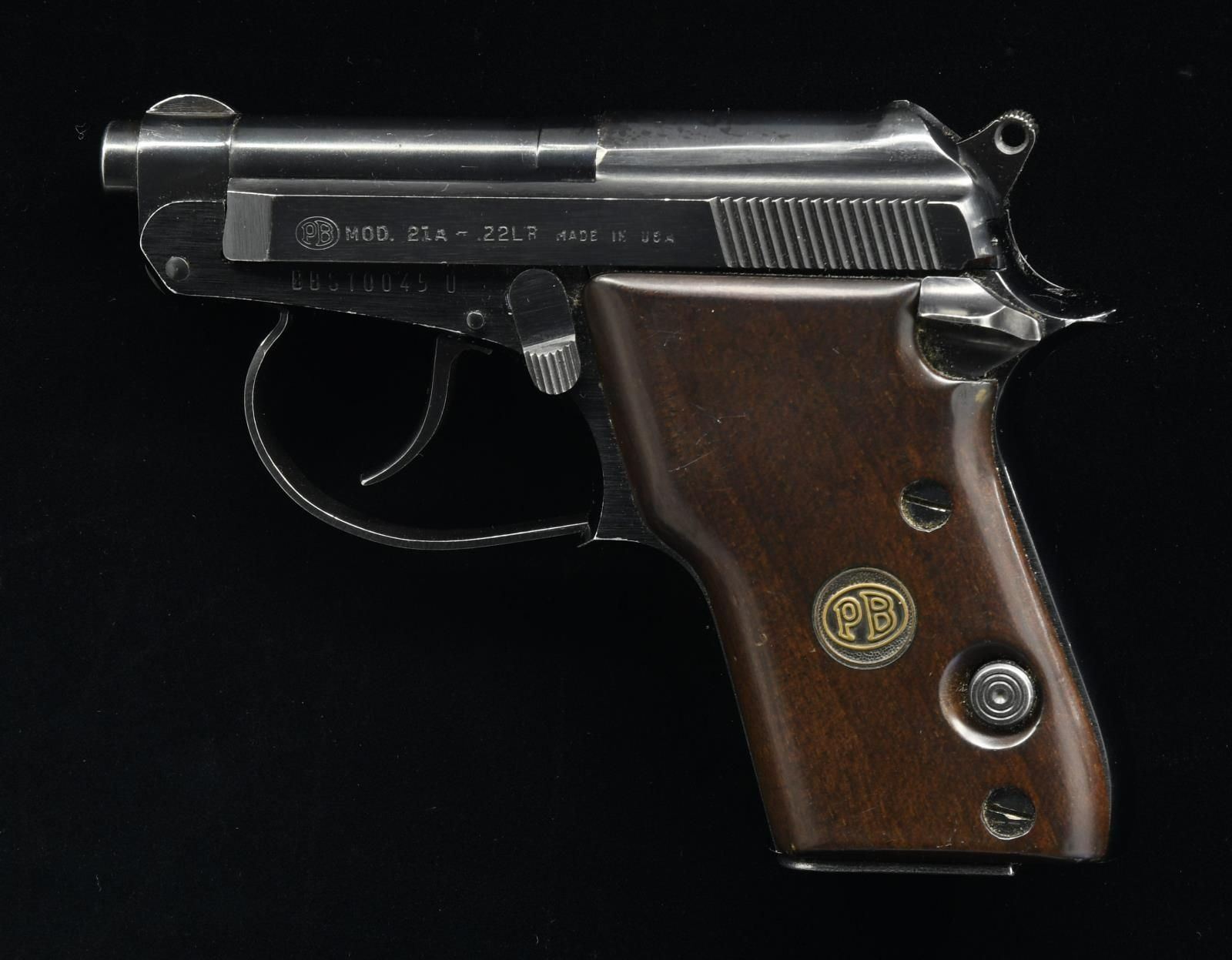 Cal. 22 LR. S# BBS10045U. Bbl. 2 1/2". Round blade front sight. Fixed rear sight. USA mfg. Beretta 21A. Blued & anodized finishes. Hardwood grips w/ gold PB logo. MAGS: 4-7 rd. UNATTACHED ACCESSORIES: Kolpin softcase. CONDITION: grips show some flaking varnish, scattered dings & handling wear. Metal retains 90% finish w/ some oxidation on top of slide, scattered flaking & handling wear. Very good bright bore. (23-5689/MJC). MODERN. $200-300.