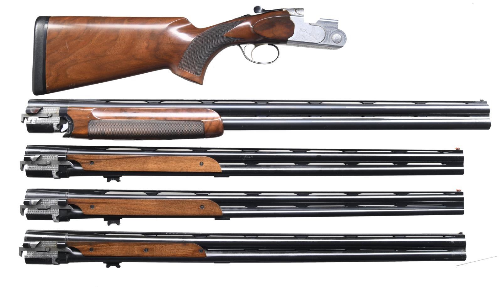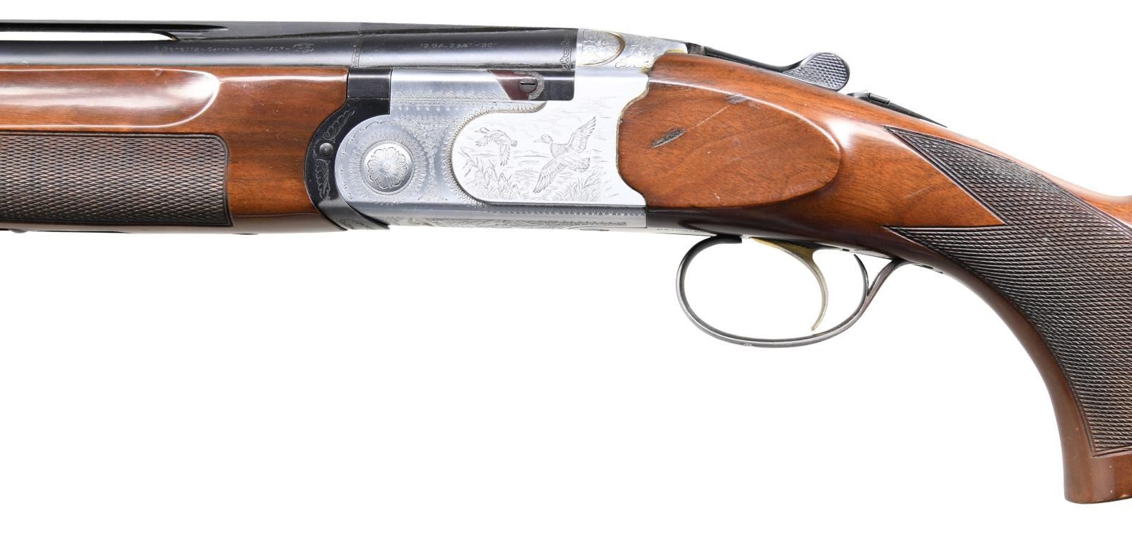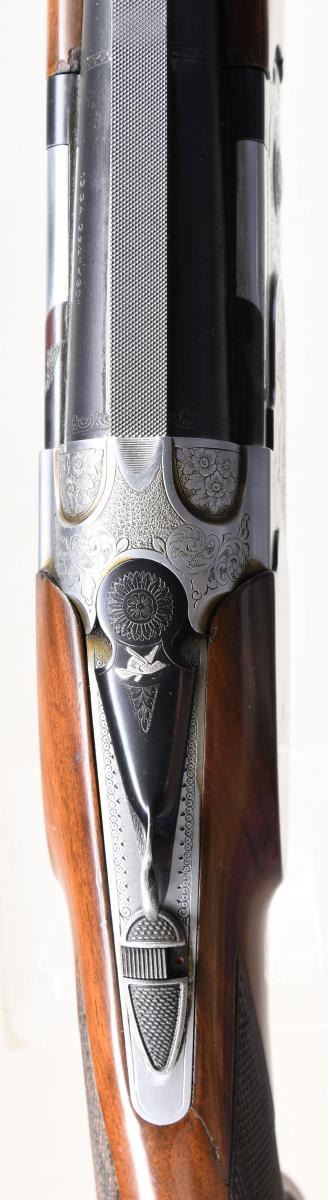 SKEET O/U SHOTGUN. Cal. 12 ga. 2 3/4", 20 ga. 2 3/4", 28 ga. 2 3/4" & 410 ga. 2 1/2". S# F30165B. The 12-ga. bbls. are 29 1/2" with vent rib, vent side ribs, & original interchangeable chokes. Set of five tubes is included. All three smaller ga. bbls. are 28" with vent ribs and ventilated side ribs. 28-ga. bbls. have a red fiber optic target front sight with a steel mid-bead. All three other bbls. The 20ga, 28ga & 410 bbls have fixed skeet chokes. All have white target front sights with steel mid-beads. Satin-finished boxlock action with foliate scroll & border ornamentation surrounds a marsh scene on the left side with flying mallards and an upland scene with a partridge on the right side. Top lever has a silver pigeon inlay. Gold-plated SST. Selective ejectors. Beavertail forearm and pistol grip sporting dimension walnut stock with cut checkering. LOP: 14" over a solid black declerator pad. UNATTACHED ACCESSORIES: gun & extra bbls. are housed in a Nasco aluminum case containing spare chokes. CONDITION: all 4 sets of bbls. retain over 98% of their blue and have very good, bright bores. Forearm iron shows carry wear. Very good action finish. The gold-plated trigger finish shows wear. Stock & forearm have their original finish and show numerous small handling marks. (23-7009/DS). MODERN. $2,750-3,500.