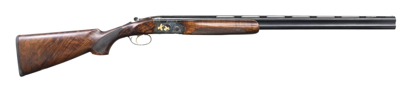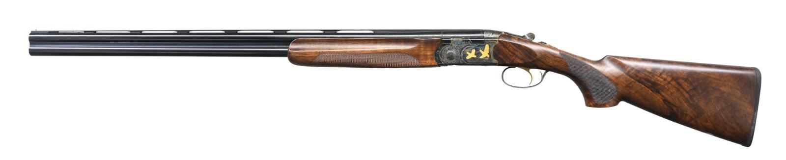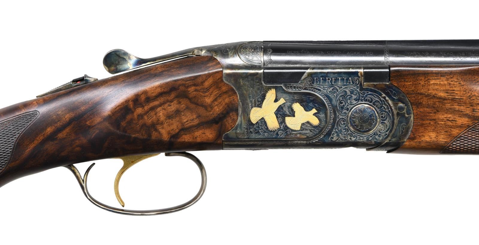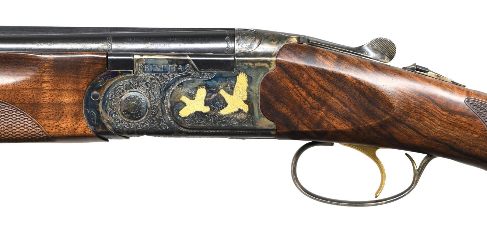 Cal. 20 ga. 3". S# R49634S. Bbl. 28" vent rib with steel bead. Interchangeable chokes with IC and skeet tubes included. Case-colored scalloped boxlock action. Foliate scroll ornamentation surrounds scenes with two gold-plated partridges on the right side and two gold-plated quail on the left. Floorplate has a gold Beretta emblem. Selective ejectors. Gold-plated single-selective trigger. Checkered forearm and pistol grip stock of satin-finished select walnut with nameplate in toeline. LOP: 14 3/8" over a thin black Beretta pad. WEIGHT: 6 lbs, 2 oz. Mfg. 2004-17. CONDITION: near excellent retaining 99% wood and metal finish. Bright, near-excellent bores. (23-7044/DS). MODERN. $1,750-2,500.