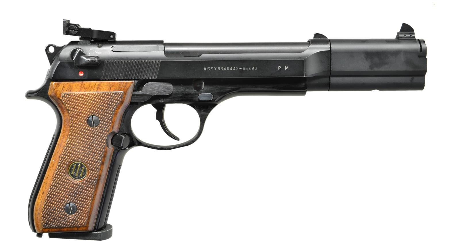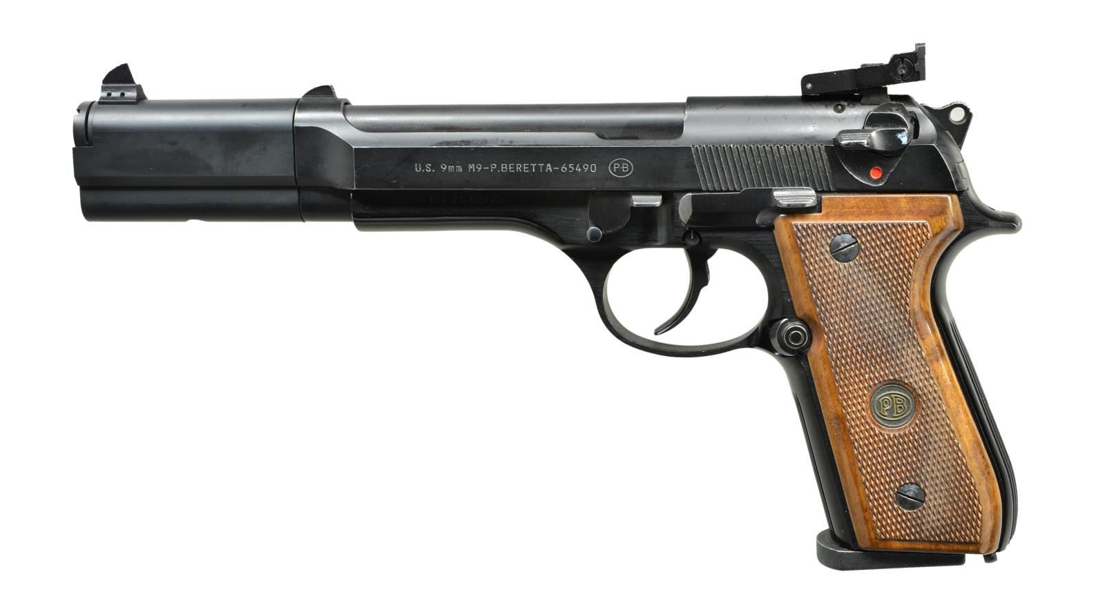 Cal. 9mm Luger. S# C17569Z. Bbl. 7 1/4". Standard M9/M92 pistol set up for competition with longer than usual barrel with weighted barrel extension and high profile white ramp front sight and adjustable rear sight with original fixed ramp sight in place as well. Blued finish with factory wooden checkered grips and PB monogram. MAGS: 1-15 rd. factory. CONDITION: metal retains about 95% original finish and grips retain strong checkering with minor usage marks. Bore is good with strong rifling and stubborn fouling or lead residue. (22-3118/CW) MODERN: $600-900.