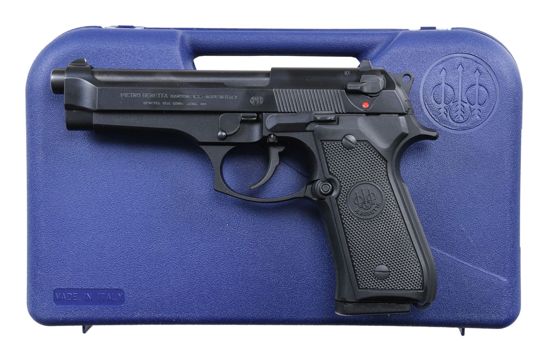 Cal. 9mm Luger. S# A194703Z. Bbl. 4 7/8". Three dot sights. Italian made Beretta 92FS pistol. Matte black finish. Checkered black grips with Beretta logo. MAGS: 3-15 rd. UNATTACHED ACCESSORIES: matching numbered factory box with hardcase, manual, paperwork & trigger lock. CONDITION: all aspects near excellent. (25-818/MJC). MODERN. $500-700.