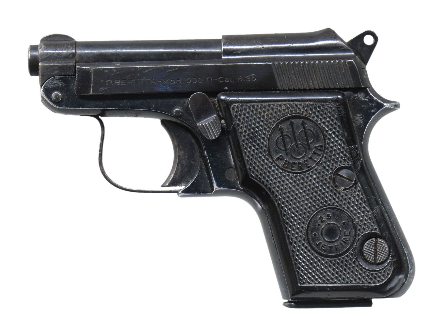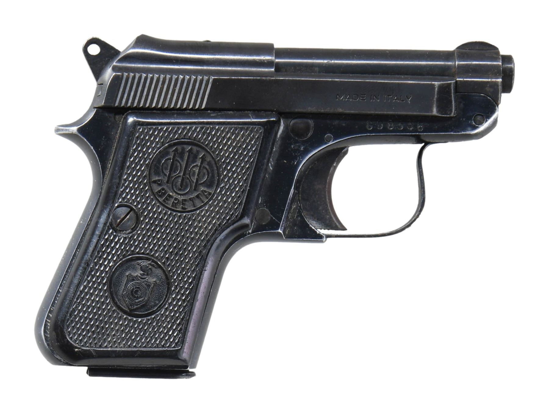 Cal. 6.35mm (25 ACP). S# G08336. Bbl. 2 3/8". Round blade front sight. Fixed rear sight. Blued & anodized finishes. Checkered black grips with Beretta monograms. MAGS: 1-6 rd. CONDITION: grips show scattered dings, checkering & handling wear. Metal retains 60% original blue & anodized finishes with scattered edge wear, thinning, flaking, handling marks, oxidation & light dings. Action functions properly when hand cycled. Very good bore with strong rifling. (25-4858/MJC). MODERN. $200-300.