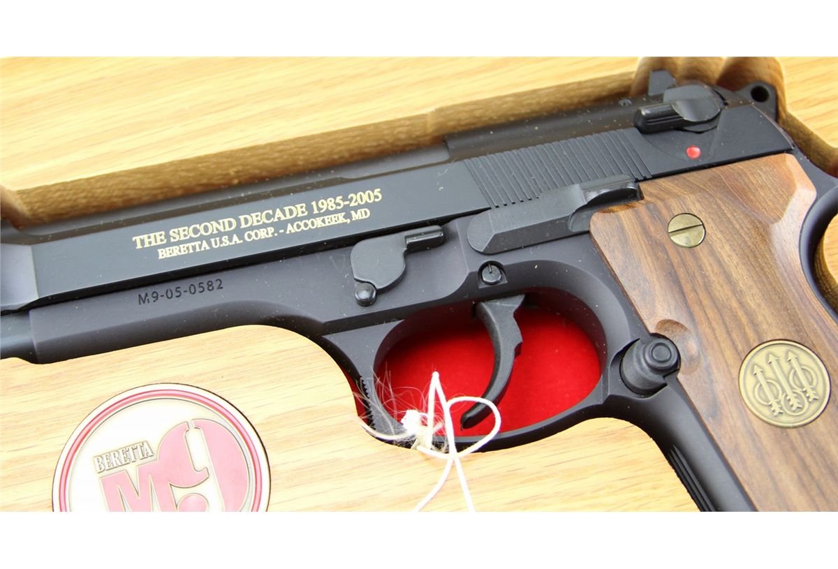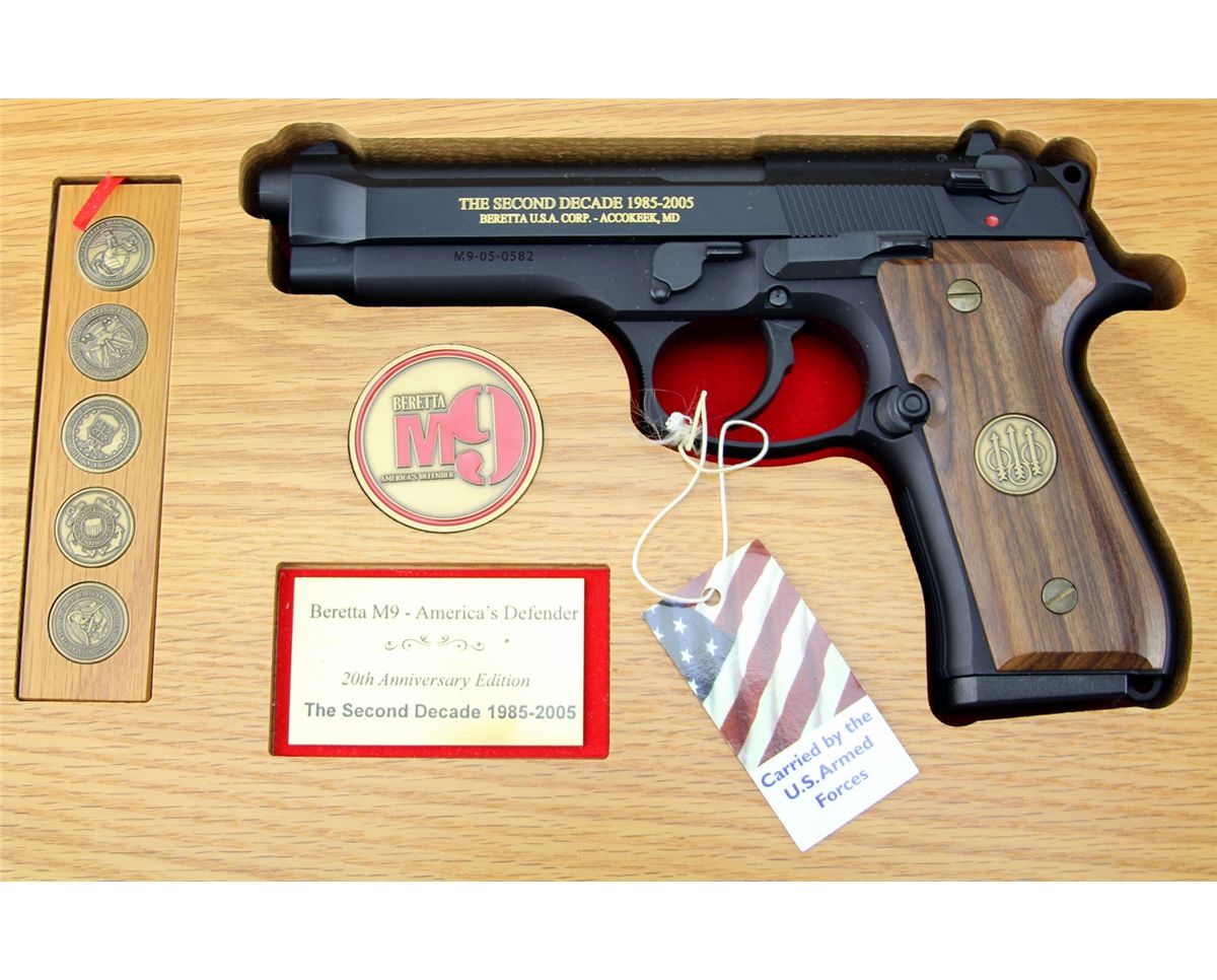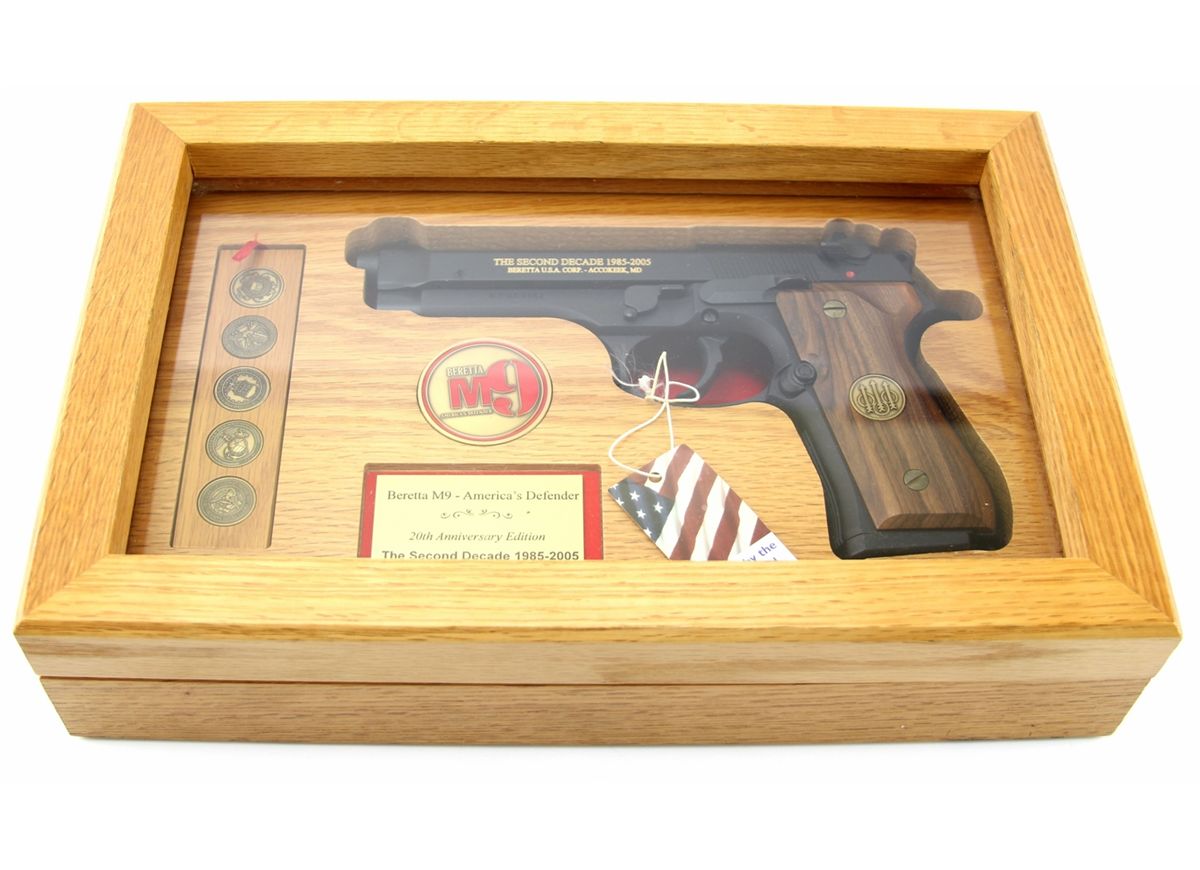 BERETTA M9 20TH ANNIVERSARY EDITION 1985-2005 Beretta M9 pistol in special 20th Anniversary Limited Edition. Slide of gun engraved in gold lettering "THE SECOND DECADE 1985-2005". gun is set in oak presentation case, with challenge token style medallion, plaque, and choice of 5 US Military branch insignia for grip inserts. Type: Pistol Manufacturer: Beretta Model: M9 Caliber / Gauge: 9 Serial Number: M9-05-0582 Condition: Excellent condition, appearing unfired
