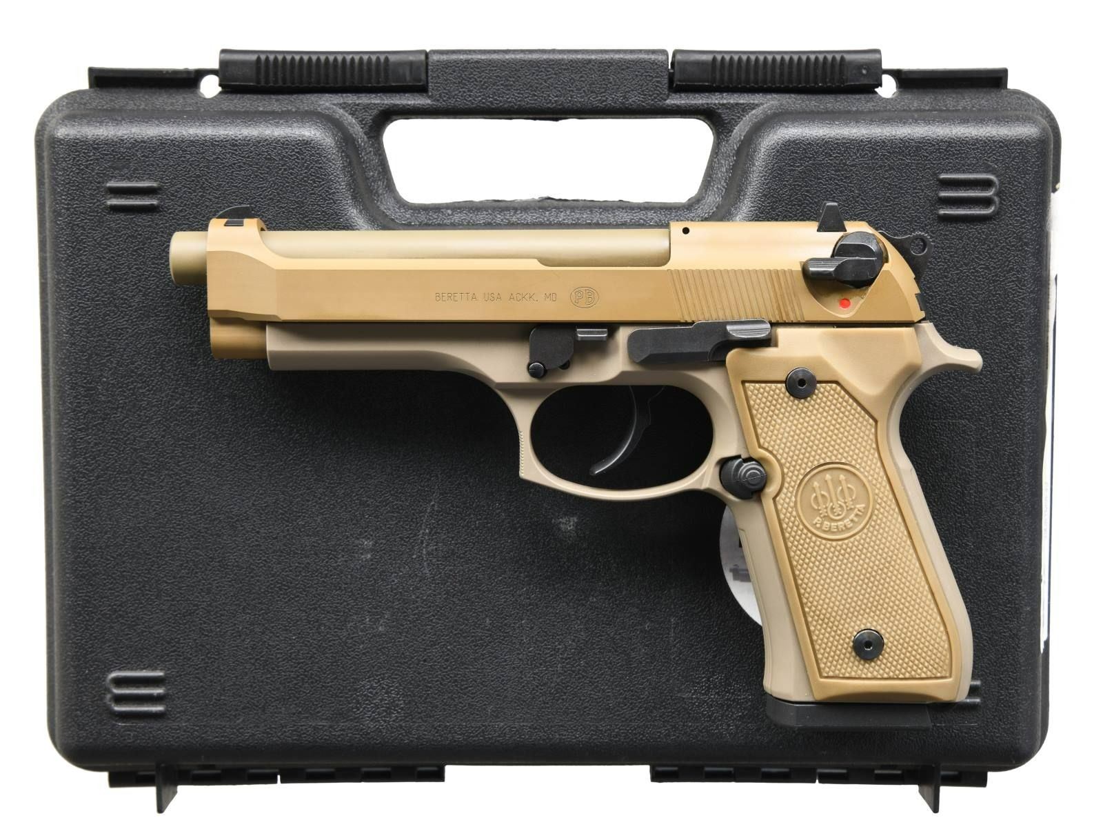 Cal. 22 LR. S# BM070703. Bbl. 5 1/4". Three dot sights. German made M9 rimfire pistol made under Beretta license. FDE finish. FDE checkered grips w/ Beretta logo. MAGS: 1-15 rd. UNATTACHED ACCESSORIES: matching numbered factory hardcase w/ manual, cable lock & paperwork. CONDITION: all aspects near excellent. PROVENANCE: The Collection of Gun Sport Ltd owned by Jon R. Thomas. (23-4359/MJC). MODERN. $300-450.