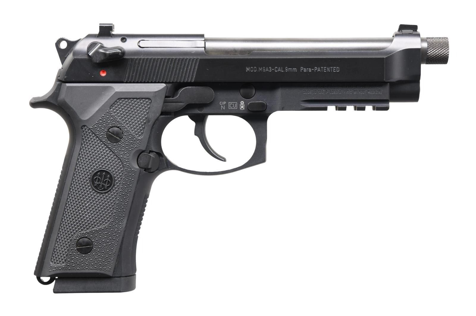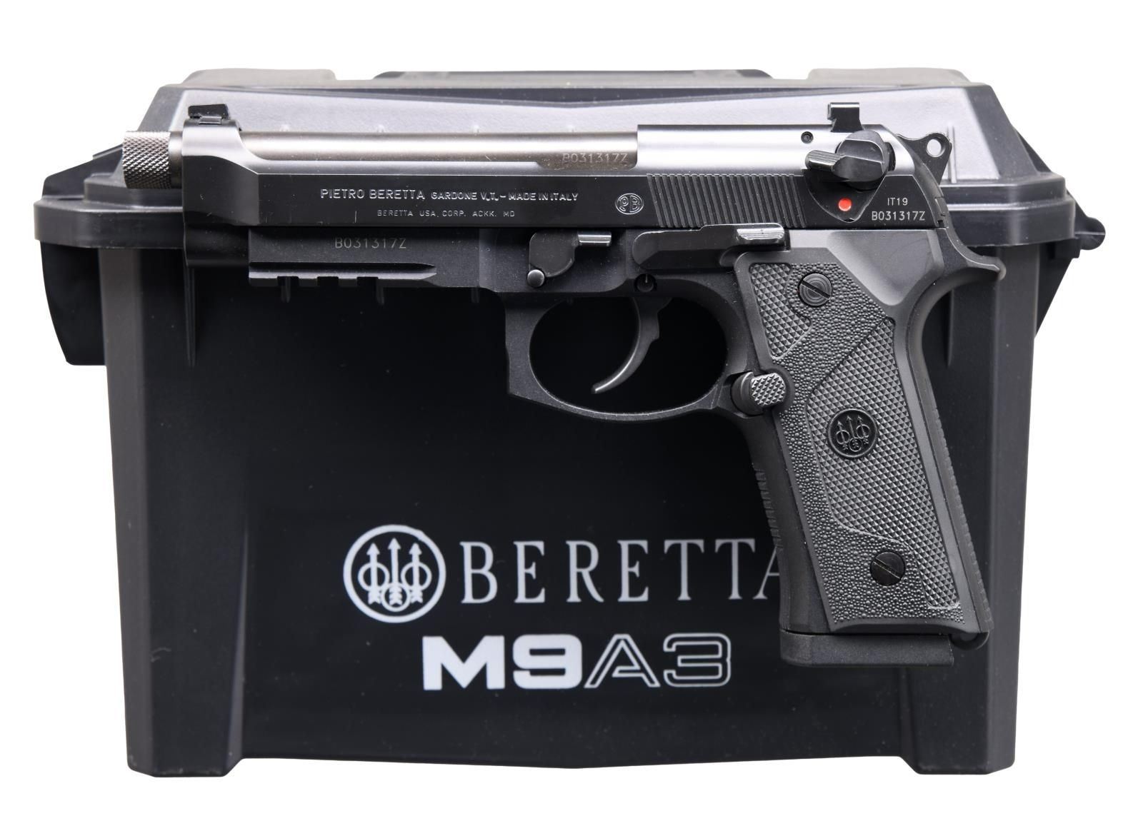 Cal. 9mm Luger. S# B031317Z. Bbl. 5" threaded w/ thread protector. Three dot sights. Italian made Beretta M9A3. Matte black finish. Frame has picatinny accessory rail. Checkered black grips w/ Beretta logo. MAGS: 3-10 rd. & 1-17 rd. Total of 4. UNATTACHED ACCESSORIES: matching numbered factory box w/ hardcase, manual & spare grip. CONDITION: all aspects near excellent. PROVENANCE: The Collection of Gun Sport Ltd owned by Jon R. Thomas. (23-4034/MJC). MODERN. $600-900.