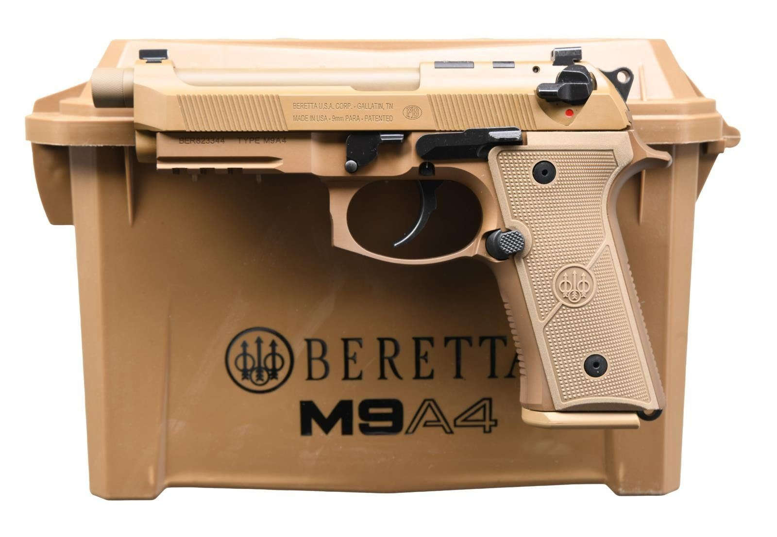 Cal. 9mm Luger. S# BER823344. Bbl. 4 3/4" threaded w/ thread protector. Three dot night sights. Slide has RMR cut for reflex sight mounting. Frame has picatinny rail for accessory mounting. FDE finish. FDE colored grips w/ Beretta logo. MAGS: 3-15 rd. UNATTACHED ACCESSORIES: matching factory cardboard box w/ hardcase, spare grip, manual, paperwork & cable lock. CONDITION: all aspects near excellent. PROVENANCE: The Collection of Gun Sport Ltd owned by Jon R. Thomas. (23-4386/MJC). MODERN. $500-700.