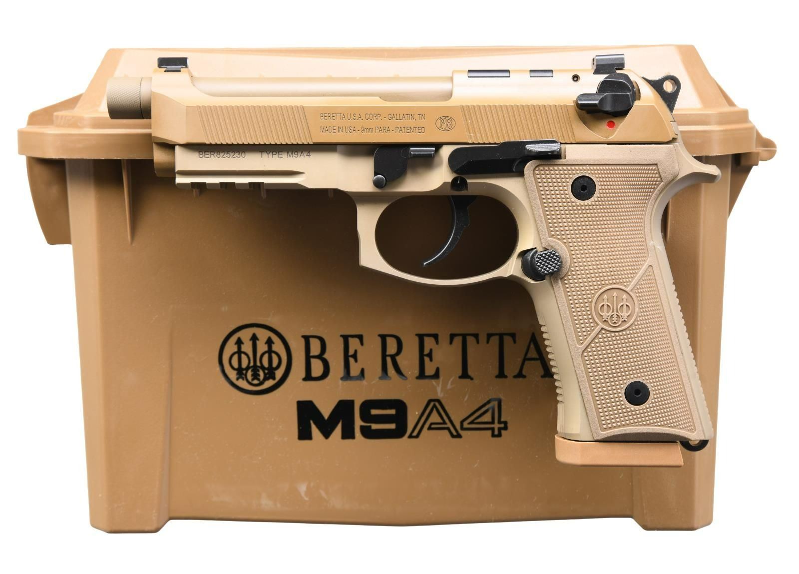 Cal. 9mm Luger. S# BER825230. Bbl. 5" threaded w/ thread protector. Three dot night sights. Slide has RMR cut for reflex sight mounting. FDE finish. Frame has picatinny rail for accessory mounting. FDE grips w/ Beretta logo. MAGS: 3-18 rd. UNATTACHED ACCESSORIES: matching numbered factory box w/ hardcase, manual, paperwork, cable lock & spare grip. PROVENANCE: The Collection of Gun Sport Ltd owned by Jon R. Thomas. (23-4395/MJC). MODERN. $500-700.