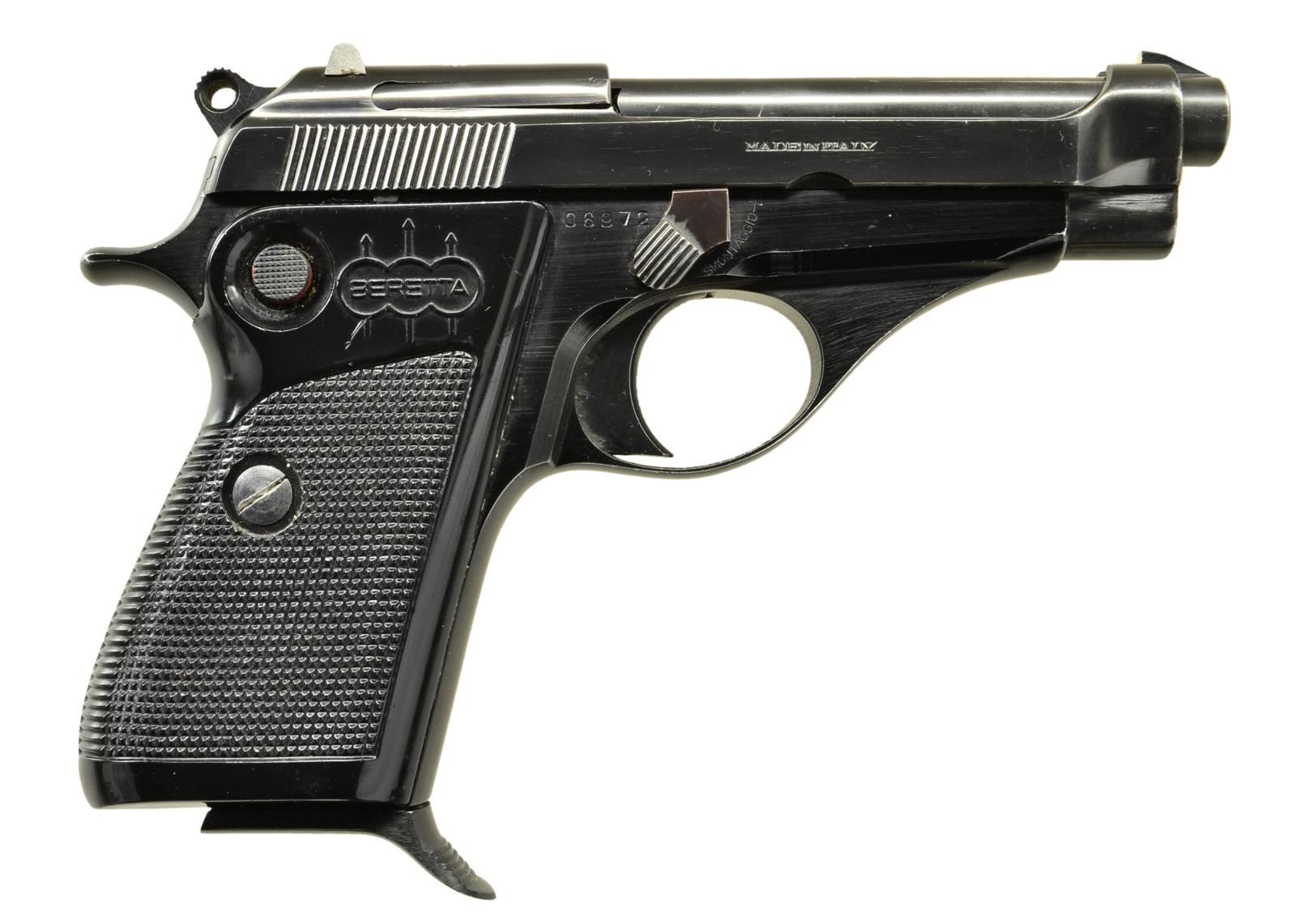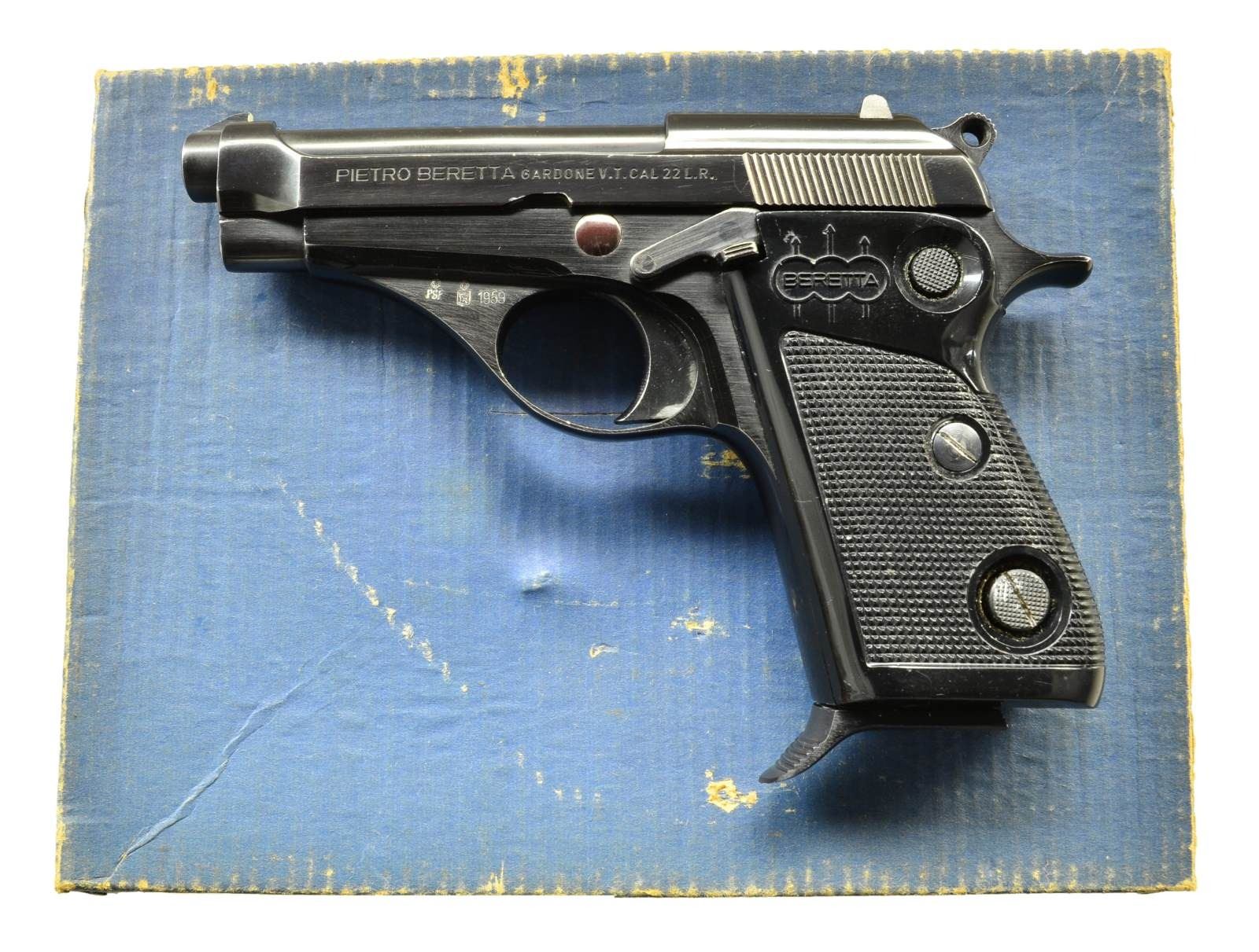 Cal. 22 LR. S# 06972. Bbl. 3 1/2". Fixed rear sight. Ramp front sight w/ white paint. Left side of trigger guard has 1959 date. Checkered black plastic grips w/ Beretta arrow logo. MAGS: 3-10 Rd. UNATTACHED ACCESSORIES: unmarked blue cardboard box hand written labeled to pistol w/ foam insert & spare 6" bbl. w/ white paint on front sight. CONDITION: grips show light handling wear. Metal retains 95% original blue. Very good bore. (22-3559/MJC). CURIO. $300-500.
