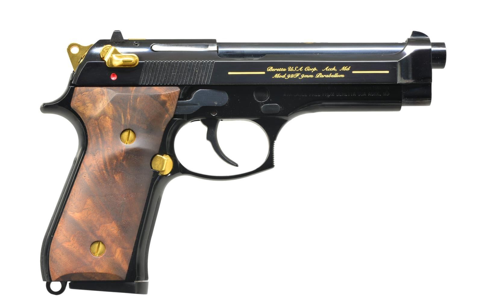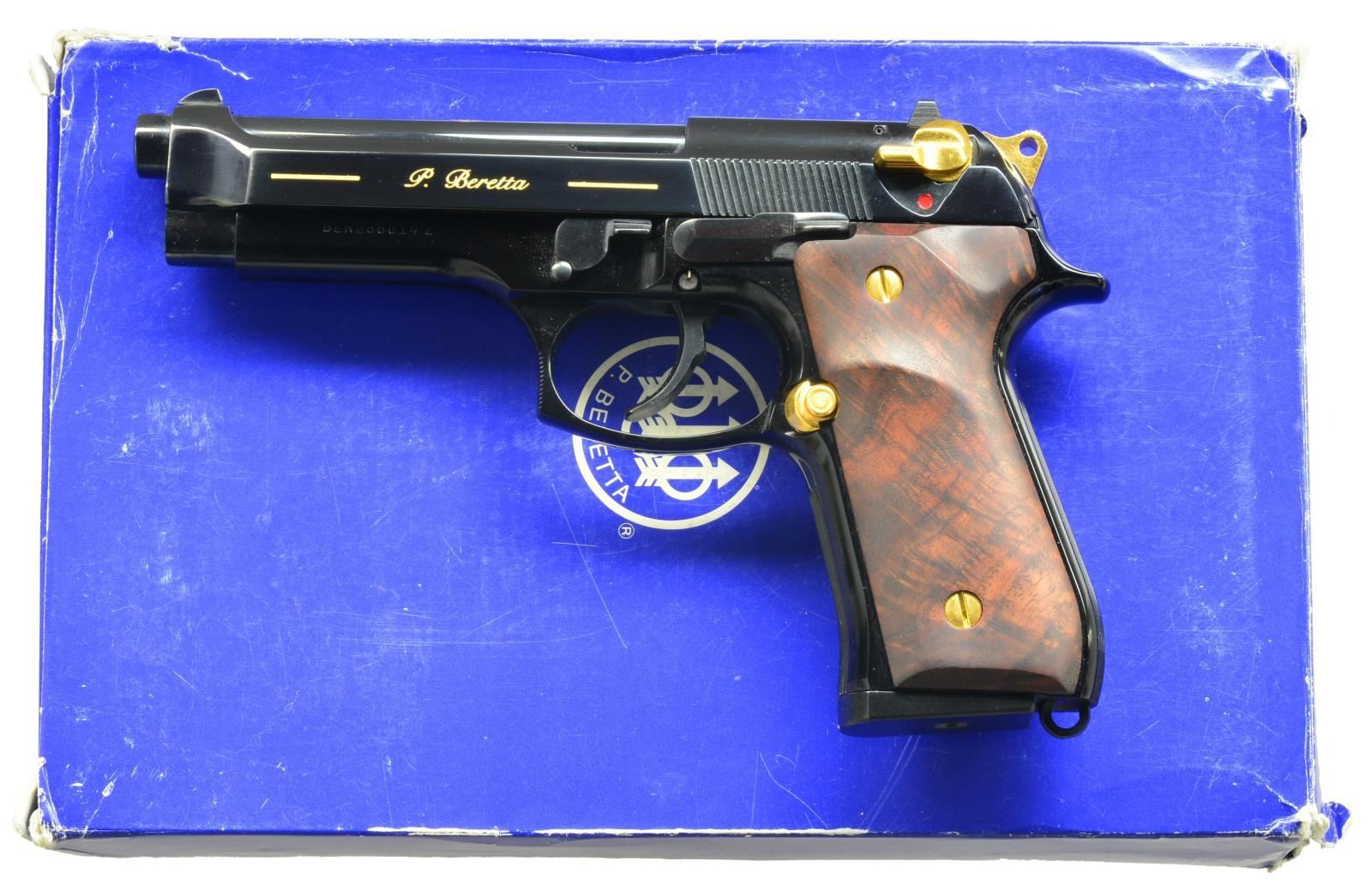 Cal. 9mm Para. S# BER286614Z. Bbl. 4.9". White dot front sight w/ single dot square notch rear sight. High polish blue finish w/ gold finished hammer, safety, grip screws & mag. release. Bbl. & slide have gold filled markings. 2 Piece satin finished fancy walnut grips. MAGS: 1 detachable 15 rd. UNATTACHED ACCESSORIES: blue molded box w/ cardboard sleeve containing owners manual. CONDITION: as new in box. (20-3111/DS). MODERN. $700-1,000.