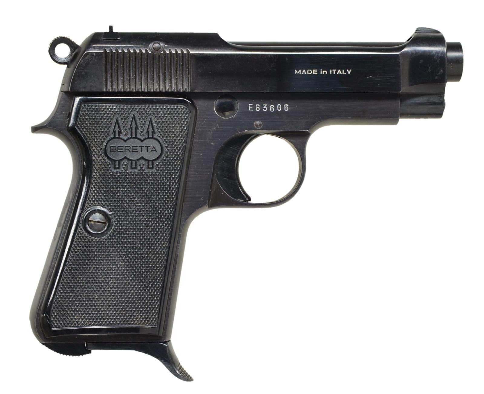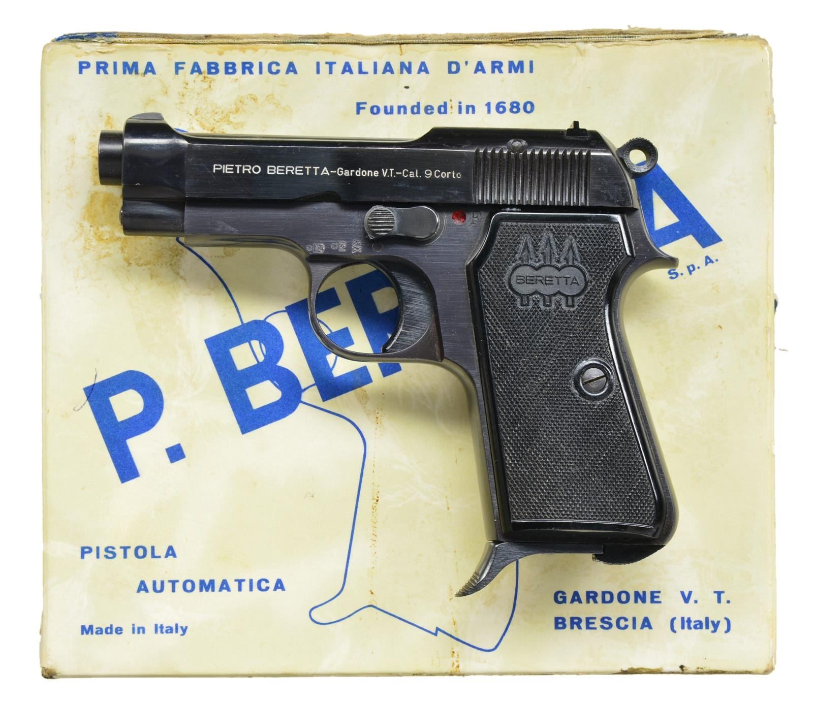 Cal. 9mm Kurz (380 ACP). S# E63606. Bbl. 3 3/4". Mfg. 1964 with XX date code. Left side of slide marked "MADE IN ITALY". Right side of frame has Italian proofs. Right side of slide has Beretta single line markings. Black plastic checkered grips w/ Beretta three arrow logo. MAGS: 1-7 rd. UNATTACHED ACCESSORIES: factory box & hang tag both serial numbered to gun. CONDITION: grips show light wear. Metal retains 97% original blue finish. Very good plus bore. (22-3566/MJC). CURIO. $400-600.