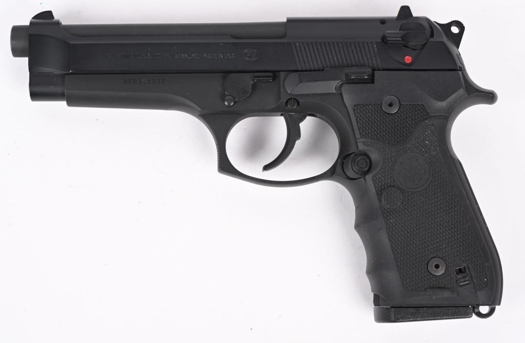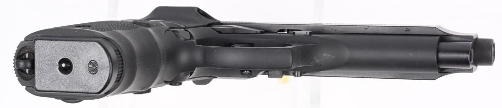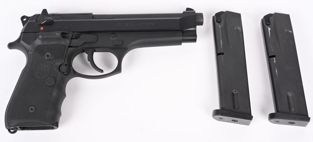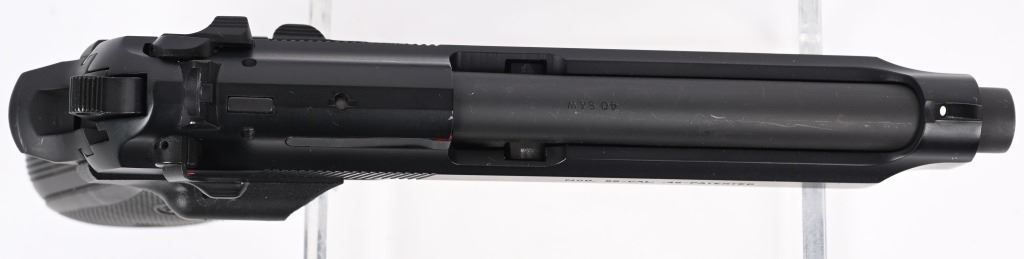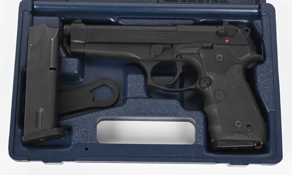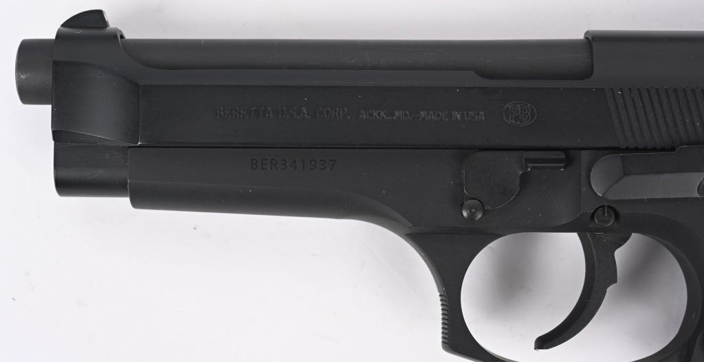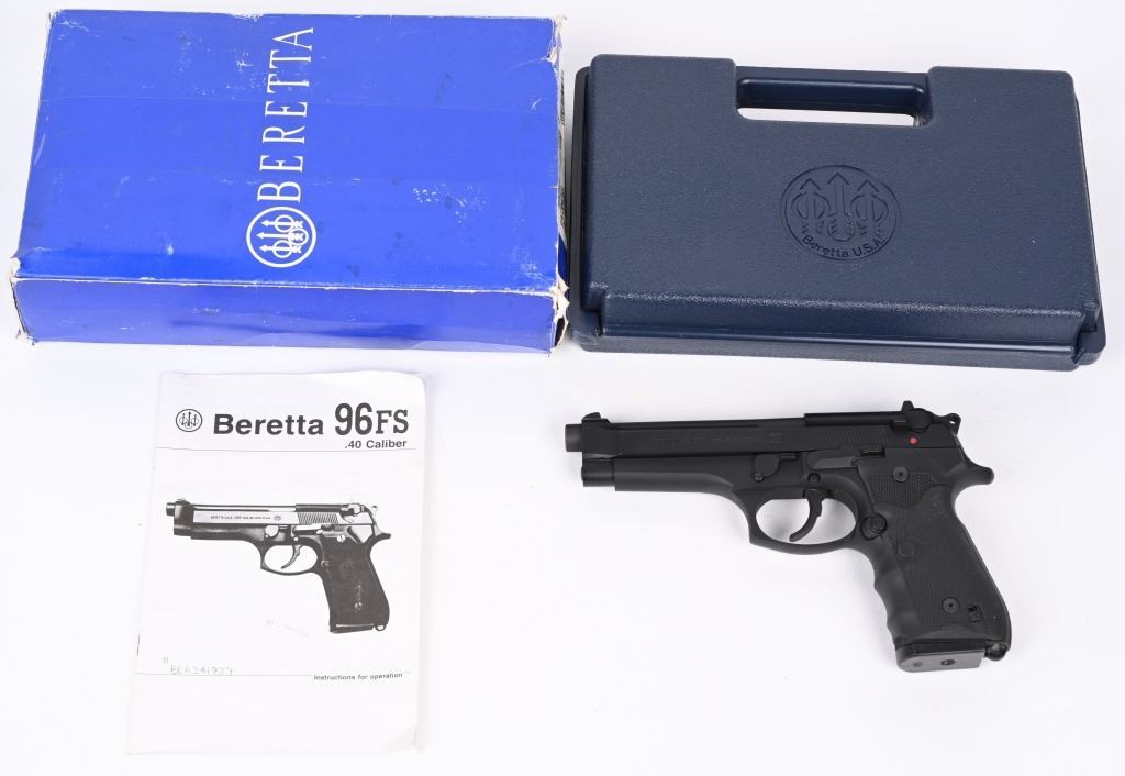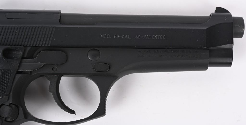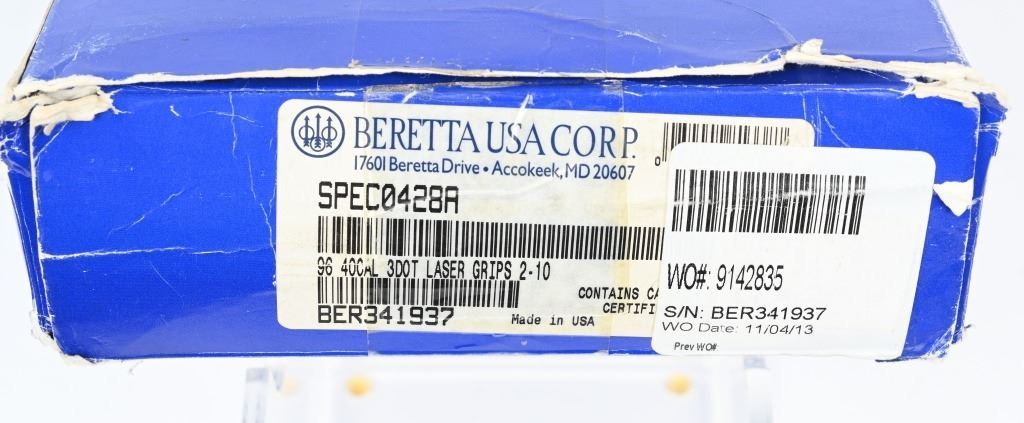 SERIAL NUMBER: BER341937. BARREL: 5". CALIBER: .40 S&W. MANUFACTURED: 2000's. Made in the USA. Standard markings and features. 3-dot blade front sight and u-notch rear. Matte blued finish. Checkered rubberized grips with factory built in laser. Includes two factory 10 round magazines, manual, hard case and matching outer box. CONDITION: Metal and grips are excellent overall, with minor handling marks. Bore is shiny with crisp rifling. Sharp mechanics. Laser works. Magazines and case are excellent. Outer box has heavy wear. MODERN