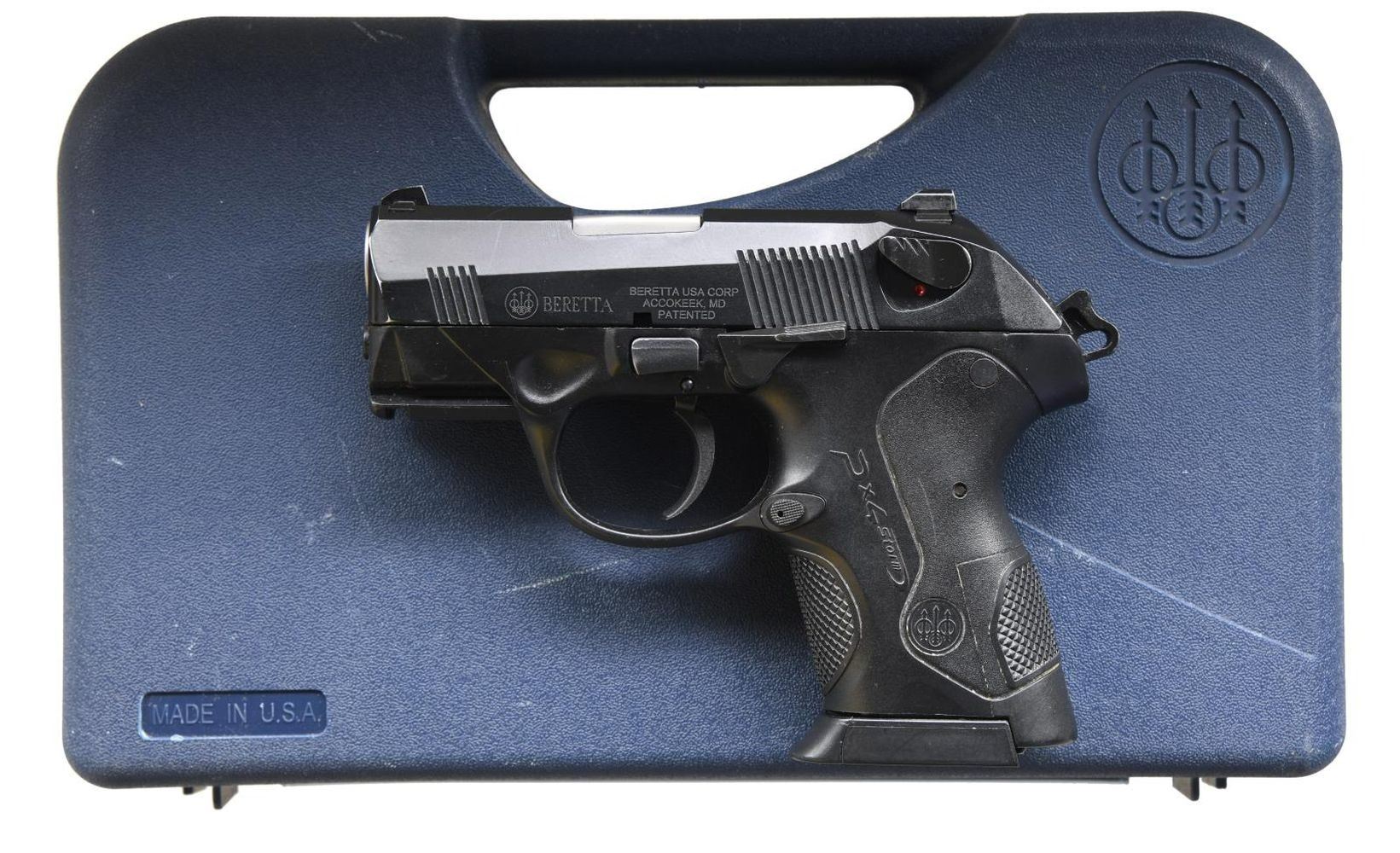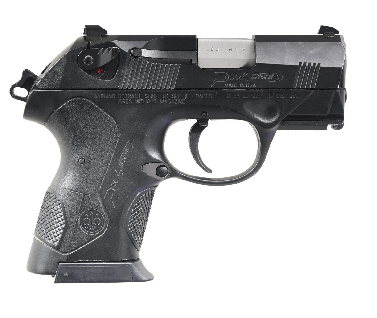 Cal. 40 S&W. S# PZ2204A. Bbl. 3". Three dot sights. Compact PX4 Storm pistol. Matte black slide w/ decocker, front & rear serrations. Black polymer frame w/ accessory rail. MAGS: 2-10 rd. UNATTACHED ACCESSORIES: factory hardcase w/ lock, two grip straps & manual. CONDITION: all aspects rate very good plus or better w/ some light handling & edge wear. (23-5214/MJC). MODERN. $300-450.