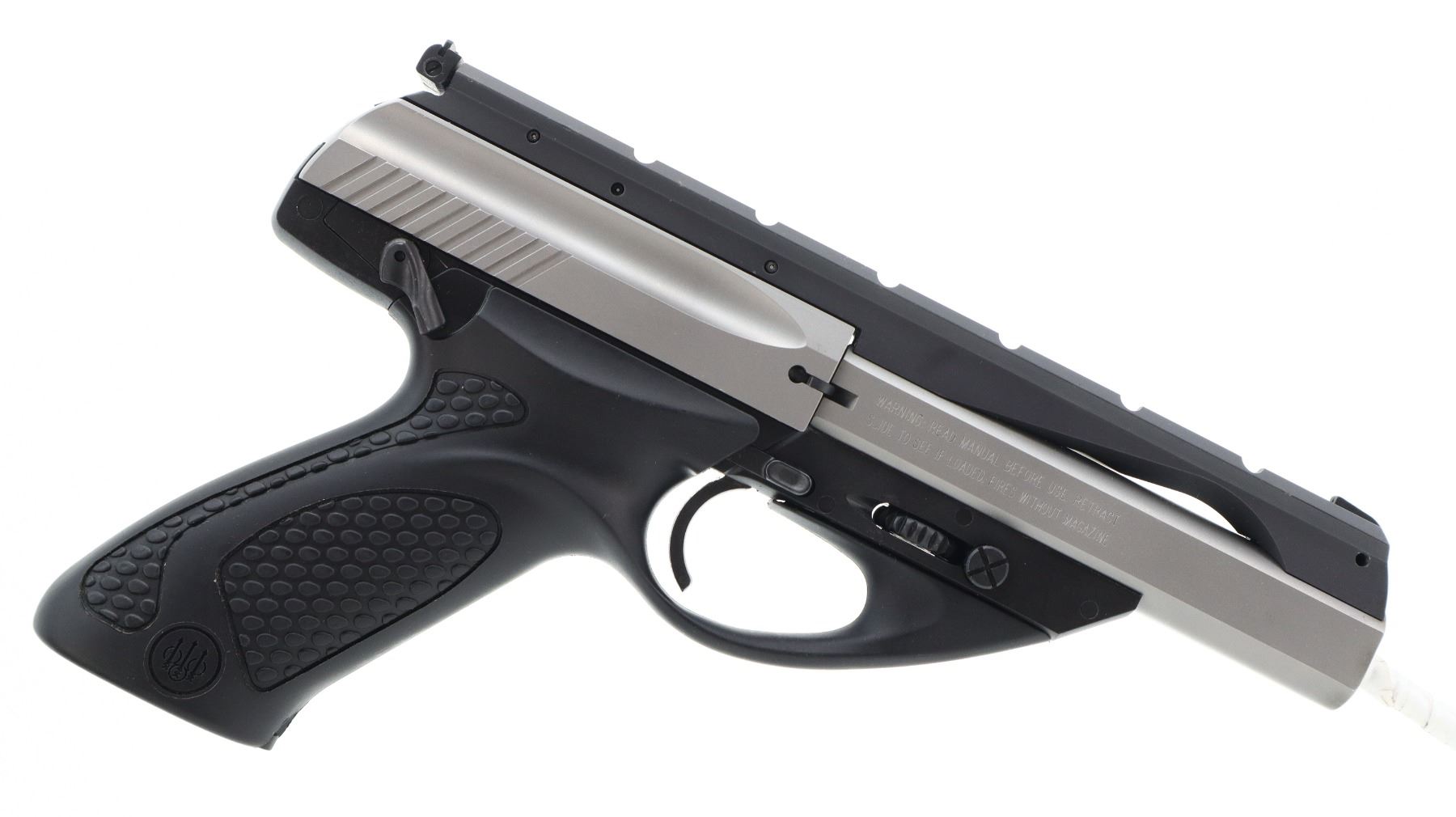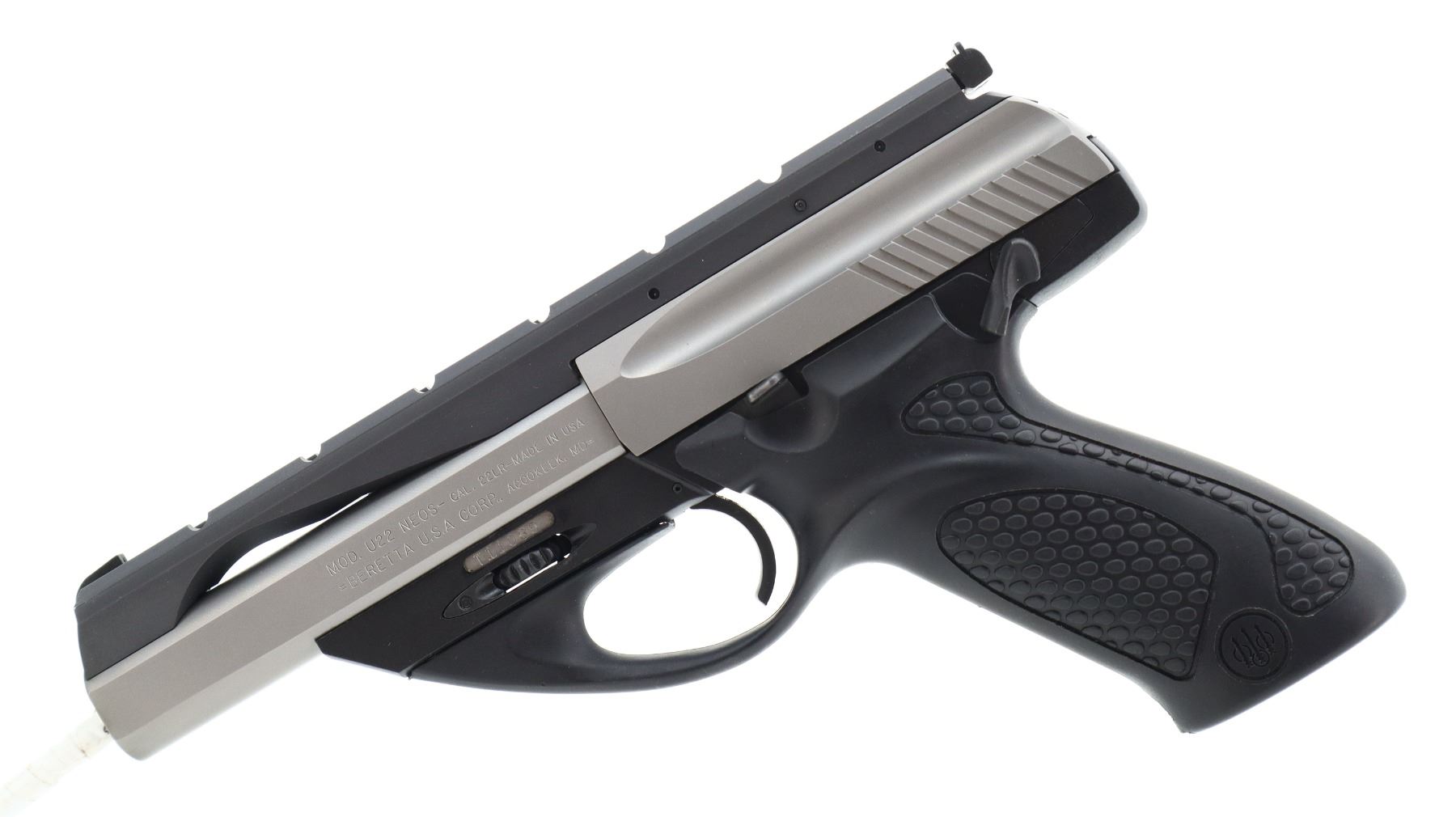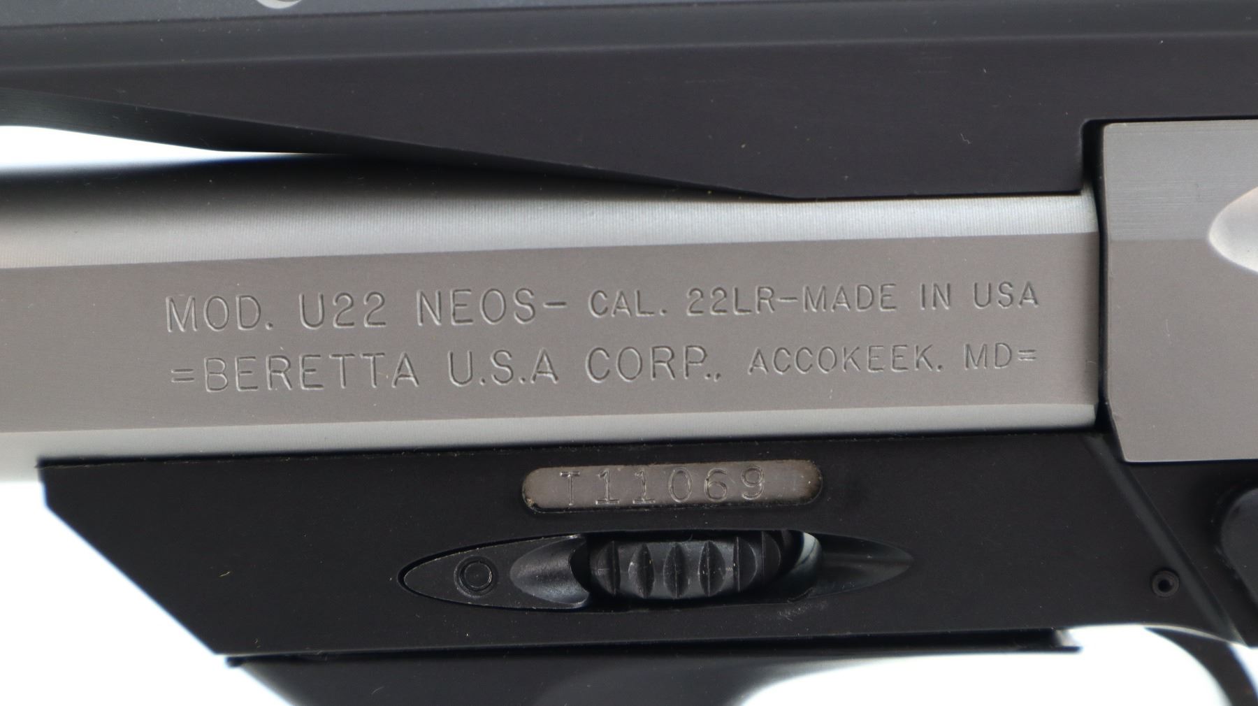BERETTA, MODEL: U22NEOS, CALIBER: 22 LR. COMES WITH 2 MAGAZINES. BORE IS EXCELLENT. BLADE FRONT SIGHT. ADJUSTABLE U NOTCH REAR SIGHT WITH WHITE OUTLINE. FULL LENGTH SCOPE RAIL. STAINLESS BARREL AND SLIDE. BLACK POLYMER FRAME WITH TEXTURED GRIP PANELS. METAL FINISH SHOWS SOME SCRATCHES AND HANDLING MARKS, GRIPS SHOW SOME SLIGHT MARKS. CONDITION 9/10, SERIAL # T11069 , BARREL LENGTH: 115MM, ACTION SEMI AUTOMATIC. CLASS, CANADIAN RESTRICTED .