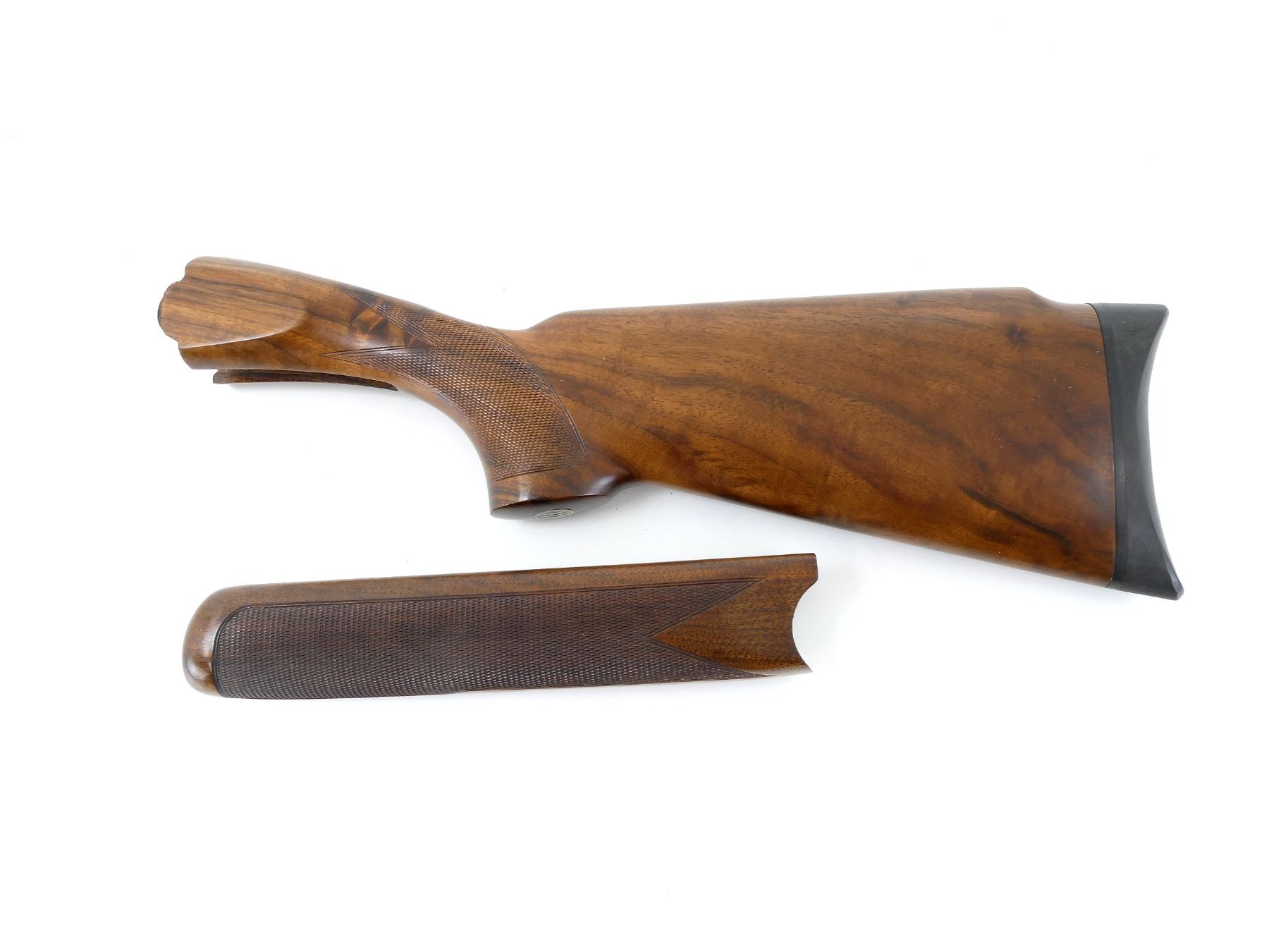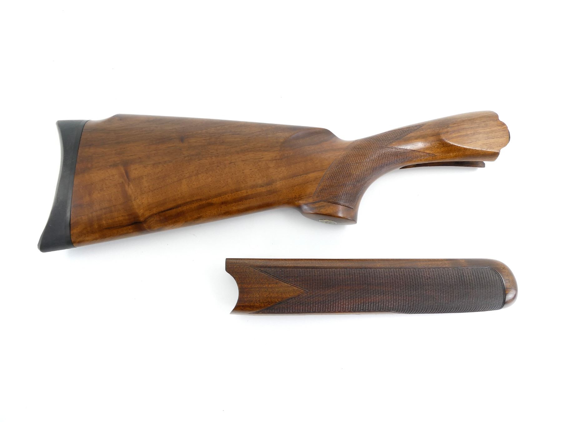LOT INCLUDES; (1) WOODEN BUTT STOCK, CHECKERED, PISTOL GRIP WITH MEDALION, BLACK RECOIL PAD, SHOWS LIGHT WEAR / TEAR, OAL APPROX. 17.25" & (1) WOOD FOREARM, CHECKERED, OAL APPROX. 10.25". MAY REQUIRE FITTING. SEE PHOTOS.