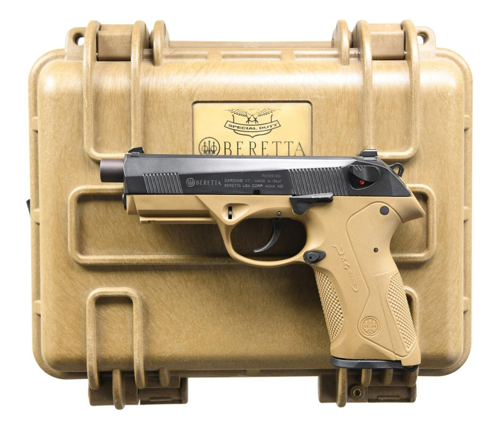Cal. 45 ACP. S# PK11490. Bbl. 4 1/2". Three dot sights. Matte black frame w/ front & rear serrations. FDE finished polymer frame w/ accessory rail. MAGS: 1-9 rd. & 2-10 rd. 3 total mags. UNATTACHED ACCESSORIES: matching numbered factory hard case w/ manual & paperwork. CONDITION: all aspects near excellent. PROVENANCE: The Collection of Gun Sport Ltd owned by Jon R. Thomas. (23-4000/MJC). MODERN. $600-900.