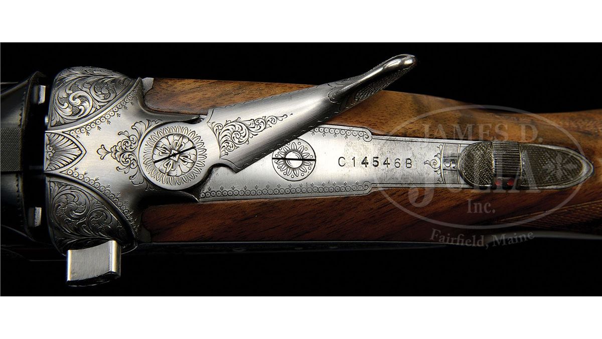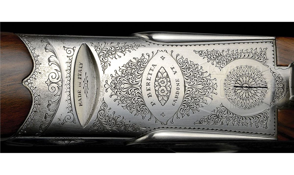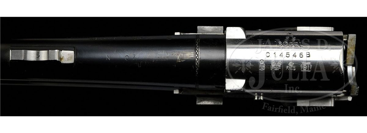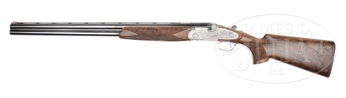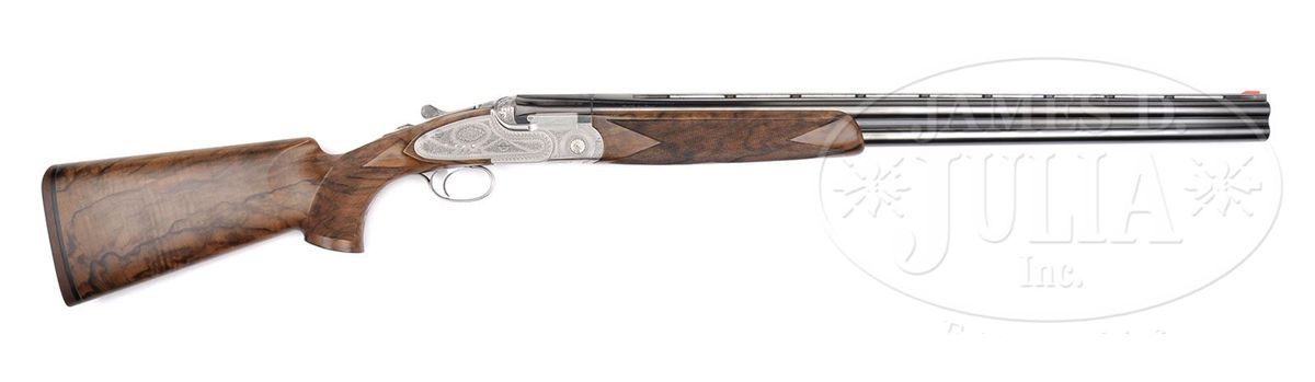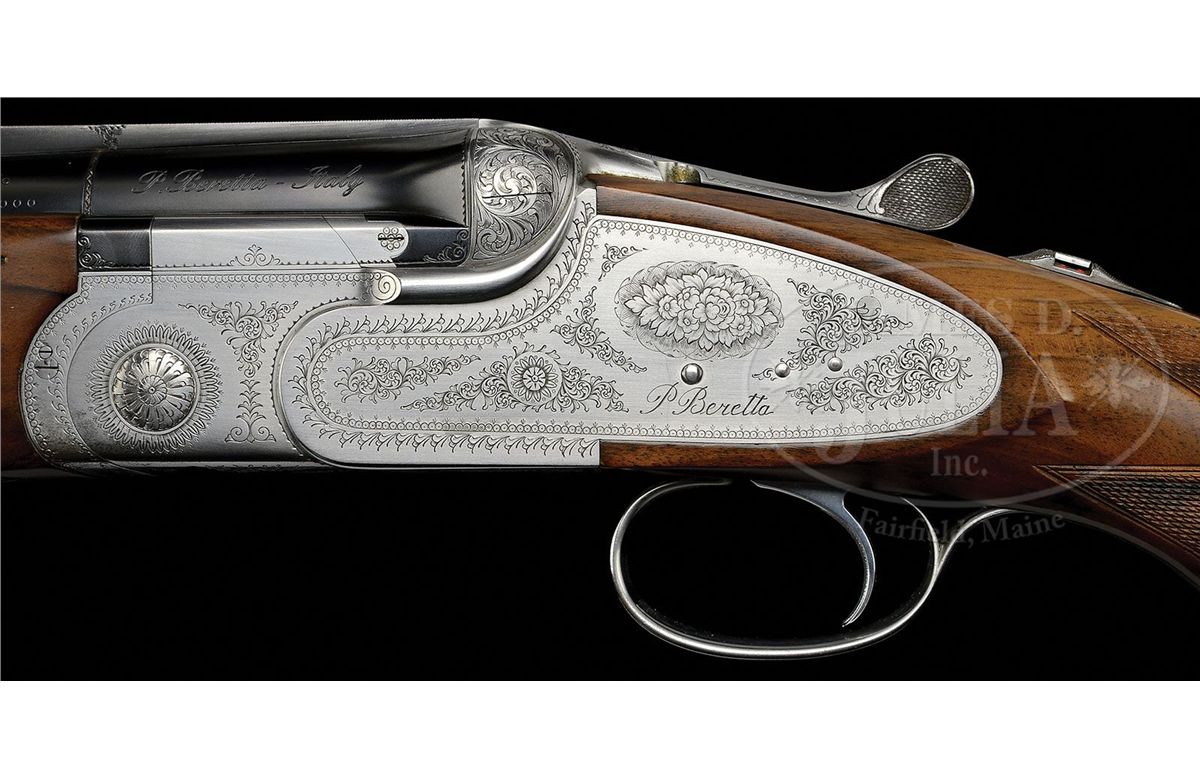 SN C14546B. Cal. 12 ga. 2-3/4" Chambers. 28" Mono-bloc bbls are fitted with raised, matted, ventilated rib. Top bbl is marked with caliber, chokes, and Beretta information, along with warning. Bottom of mono-bloc is stamped with 1997 Italian nitro proofs, grade, and SN. Nicely filed, low profile, coin finished, OU sidelock action is engraved with about 60% coverage well cut medium scroll with rose bouquet accents on each lockplate. "P Beretta" is on each lockplate, and on central lozenge on bottom of action, along with "Gardone V.T." Striking, lightly fiddle figured and well marbled European walnut full pistol grip buttstock measures 14-1/2" over thin solid red pad, and features right hand palm swell and point pattern checkering with line borders at grip. Matching one piece forend has Deeley type release. Bore diameter: top -.723, bottom -.723. Bore restrictions: top -.033 (Full), bottom -.020 (Mod). Wall thickness: top-.037, bottom -.034. Drop at heel: 2-1/4", drop at comb: 1-3/8". Weight: 8 lbs. 2 oz. LOP: 14-1/2". Nizzoli tan leather case with stitched leather corners has brass combination lock. Case is lined in olive green felt, and has Beretta black leather label stitched into lid, and contains 3 pc rosewood and brass cleaning rod, mops and brushes in black leather case, and a pair of plastic snap caps. CONDITION: Excellent, essentially as new, possibly unfired since proof, with a few light assembly marks on mono-bloc. There is some slight toning of coin finish on top tang, bottom of forend iron, and latch. Case leather is excellent, with a few minor marks, rubs, and some slight discoloration. Straps and handles are excellent. Interior cloth is excellent. Cleaning rod is still in bubble wrap. 4-48641 MGM23