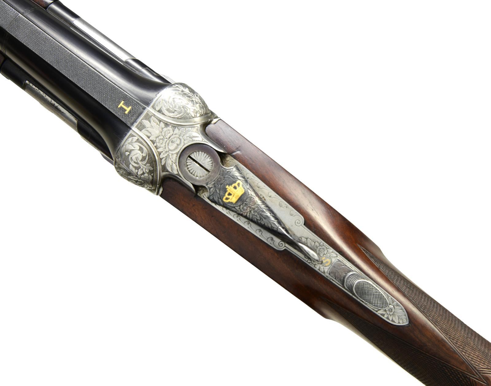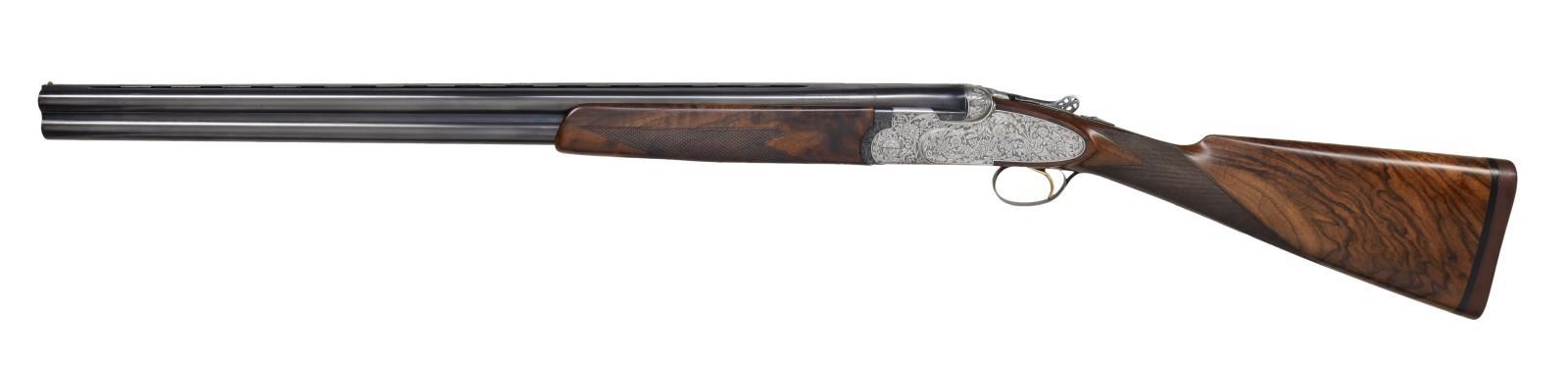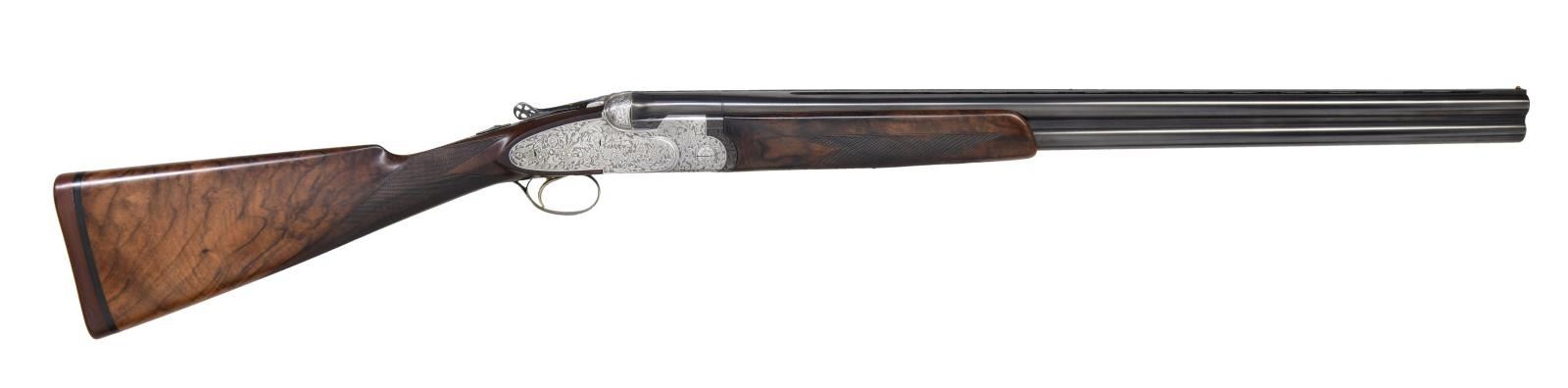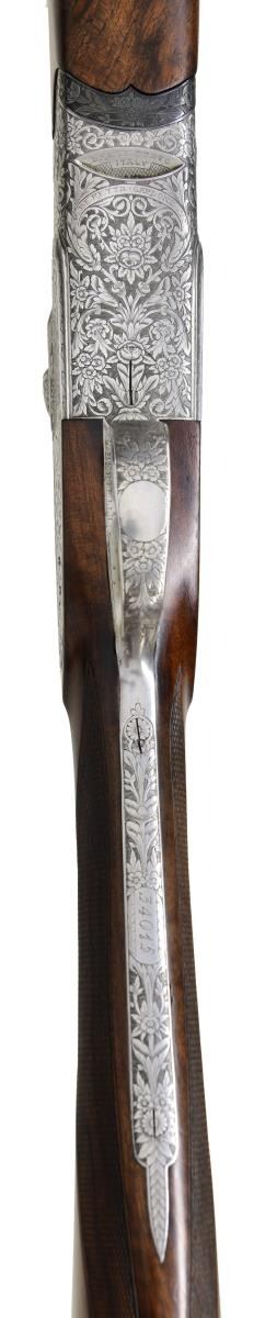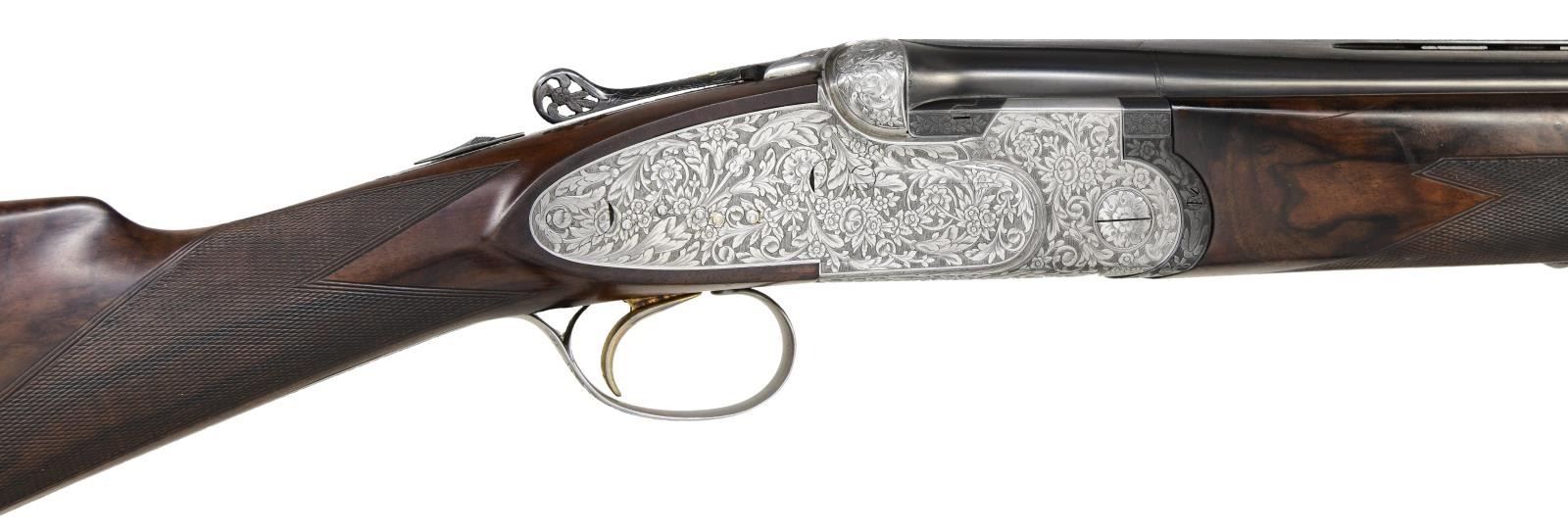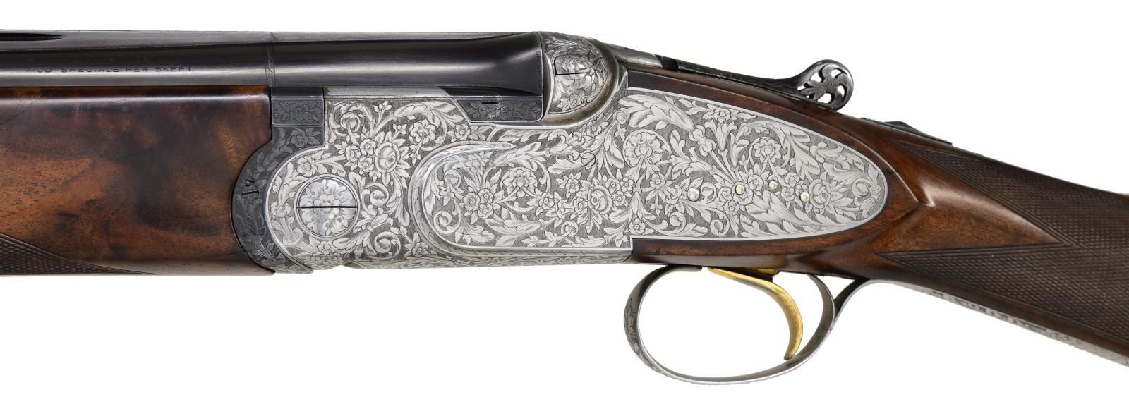 Cal. 12 ga. S# 34015. Bbl. 28" vent rib. Breech end of bbls. are marked w/ gold roman numeral one. Hand detachable sidelock action w/ Greener crossbolt locking. Gold finished sst. Selective ejectors. Action has full coverage foliate engraving signed by Bertelli on floorplate. Pierced top lever has gold crown. Forearm & straight hand stock w/ long tang trigger guard of fancy marbled European walnut having dark streaking. Point pattern hand checkering. LOP: 14 1/8" over a solid brown recoil pad. DAC: 1 1/2". DAH: 2 1/8". Near neutral cast. WEIGHT: 7 lbs, 5.4 oz. Bore diameter: U .730 O .728. Minimum wall thickness: U .037 O .038. Chokes are opened. Under bbl. is .010 less than bore diameter. Over bbl. is .005 more open than bore diameter. CONDITION: bbl. retains over 97% blue. Action has very good satin finish. Original wood finish shows light wear w/ a few small marks. Chambers & forcing cones are lengthened. Very good bright bores. Smooth opening action, top lever sits left of center. (24-2193/DS). CURIO. $10,000-13,000.