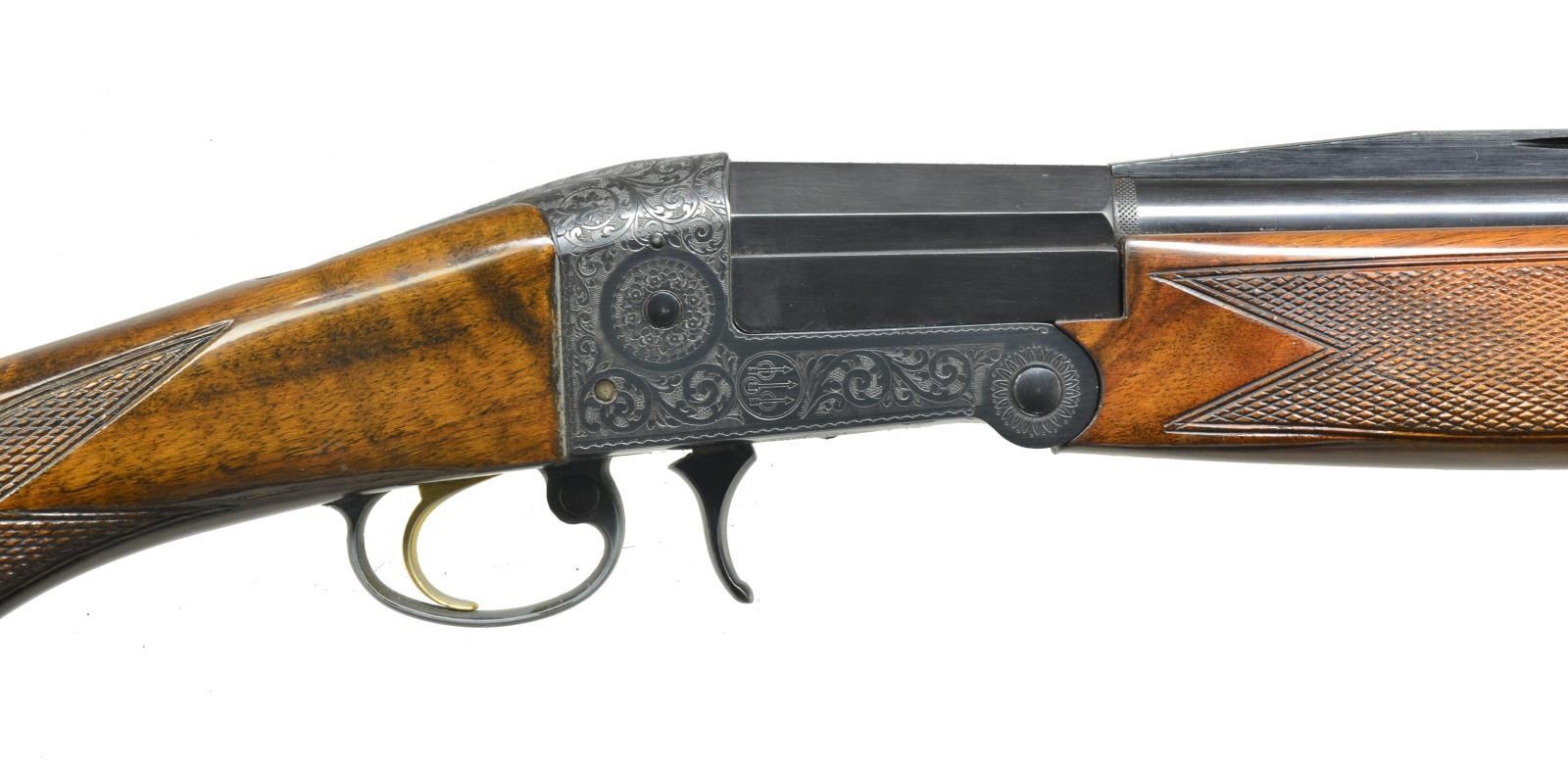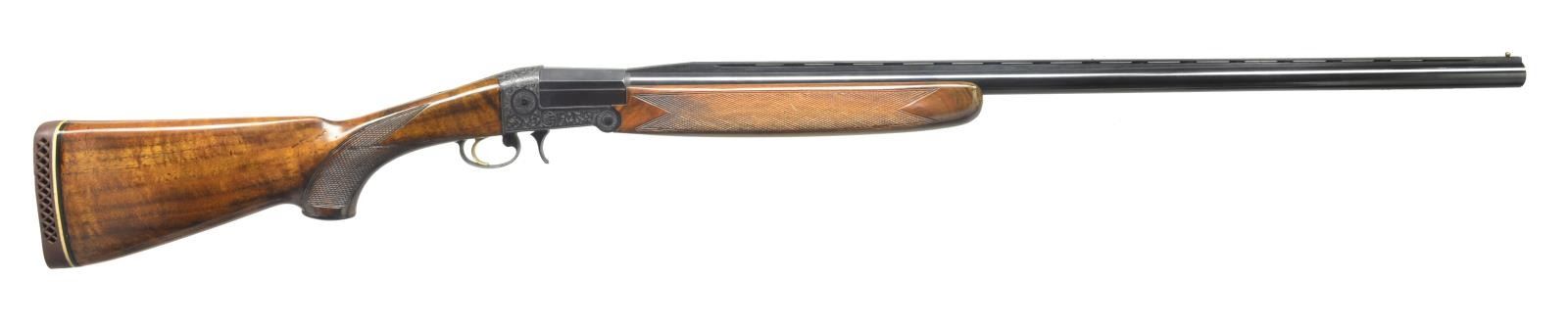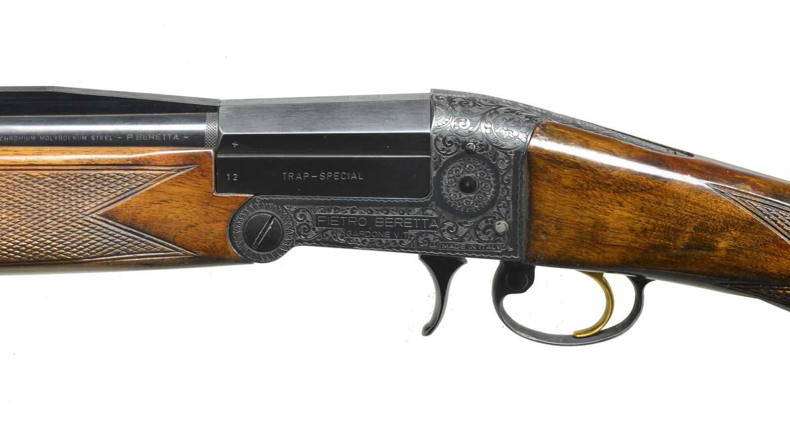 Cal. 12 Ga, 2 3/4. S# D136346. 31 1/2" Monobloc bbl. is fitted w/ slightly raised ventilated rib, choked full. Left side of monobloc is marked w/ cal. & “TRAP-SPECIAL”. Blued action w/ opening finger lever in front of trigger guard has gold plated trigger. Action is engraved w/ near full coverage lg. shaded scroll. Maker’s name & address are on left side, along w/ “MADE IN ITALY”. Beretta logo is on right. Nicely figured European walnut capped pistol grip buttstock measures 14" over “White Line” pad. Point pattern checkering is at grip, matching full beavertail forend screws to bbl. & does not have an iron. STOCK: LOP: 14". DAC: 1 5/8". DAH: 1 7/8". WEIGHT: 7 lb. 14 oz. CONDITION: fine as partially refinished. Metal parts retaining over 80% original blue. Stocks refinished over some minor marks. Pad is relatively new. Bore is good, action is tight.. PROVENANCE: Collection of Alan Bradley Shepherd. (20-4002/MGM). MODERN. $500-800
