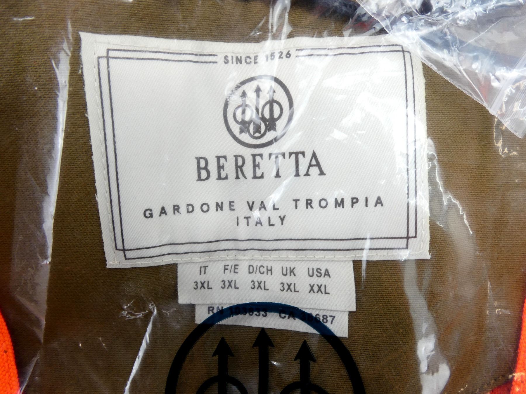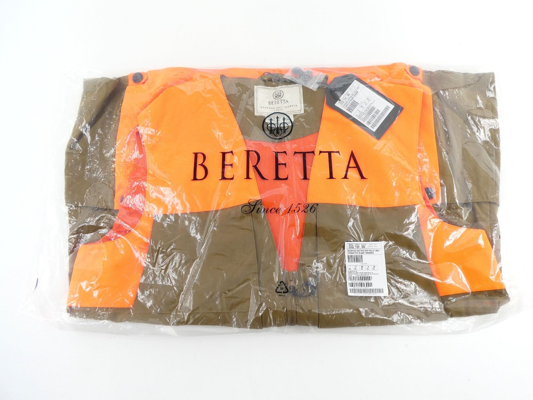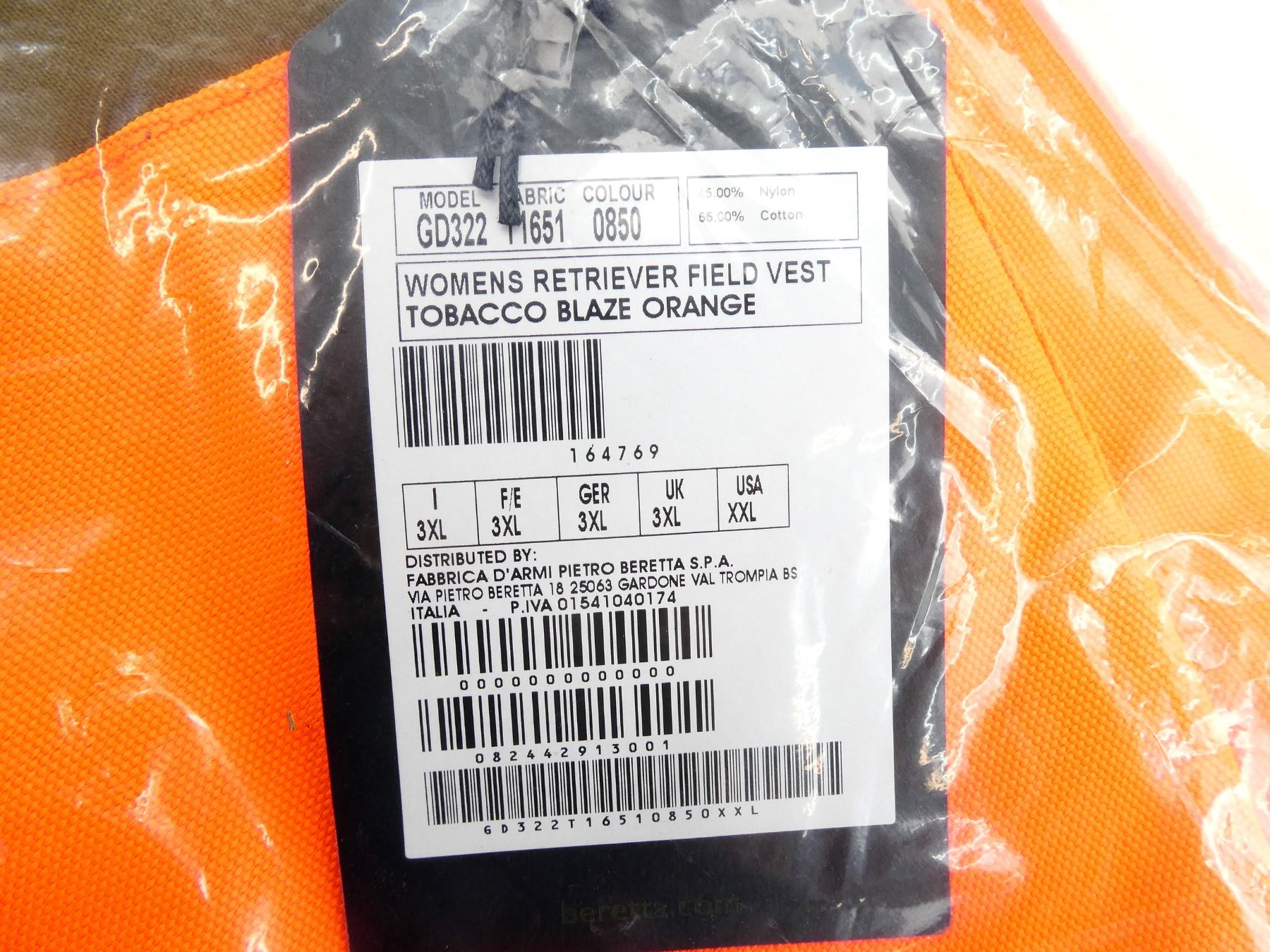 (1) FIELD VEST, ZIPPERED (WORKS), TOBACCO BLAZE ORANGE COLOUR FOR HUNTING, VARIOUS POCKETS, MARKED: "BERETTA", "3XL", ETC., NOS IN ORIGINAL SEALED PACKAGING. SEE PHOTOS.