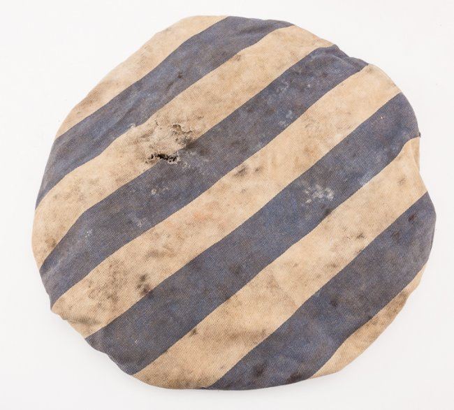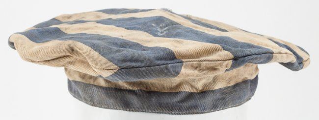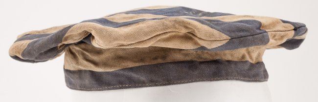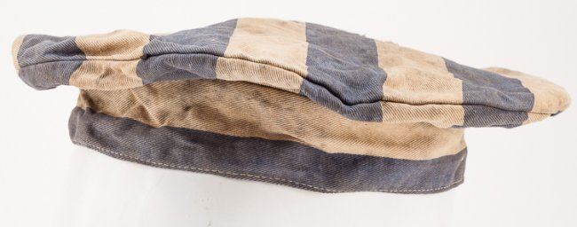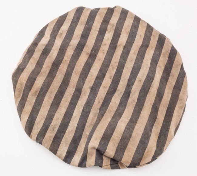 Lot of two caps recovered from the notorious German concentration camp Bergen-Belsen in Lower Saxony by a British medic. The caps are both of the common "wide-topped" construction with alternating white and blue stripes, one cap having wider stripes than the other but both patterns often used in the camps. The caps are very musty and worn within, apparently having been stored in a very damp location for a long period of time. They are accompanied by a ca. 1970 letter of provenance from Frederick Browne, a British medic who helped liberate the camp and returned there in 1963. Browne was also the first president of the Dunkirk Veterans' Association. He writes Secretary J. W. Upton of another veteran's association of his time at Bergen-Belsen: "?Yes I was one of the first in as a medic,and I can tell you the sights I witnessed still haunt me to this day?I returned a few years ago and the place is nothing like it was. There is now a memorial, a photo of which I enclose [included]?I was told by my superior to obtain some of the inmates uniform[s] for future exhibition purposes, and hence I have two caps and a jacket I can bring?I am sure this will interest your members?". The caps were left with Upton and thereafter passed to our consignor, the War Museum in New York. Also included is a newspaper article picturing Browne, Belsen, and retelling his account of his service at the camp and his return there post-war.