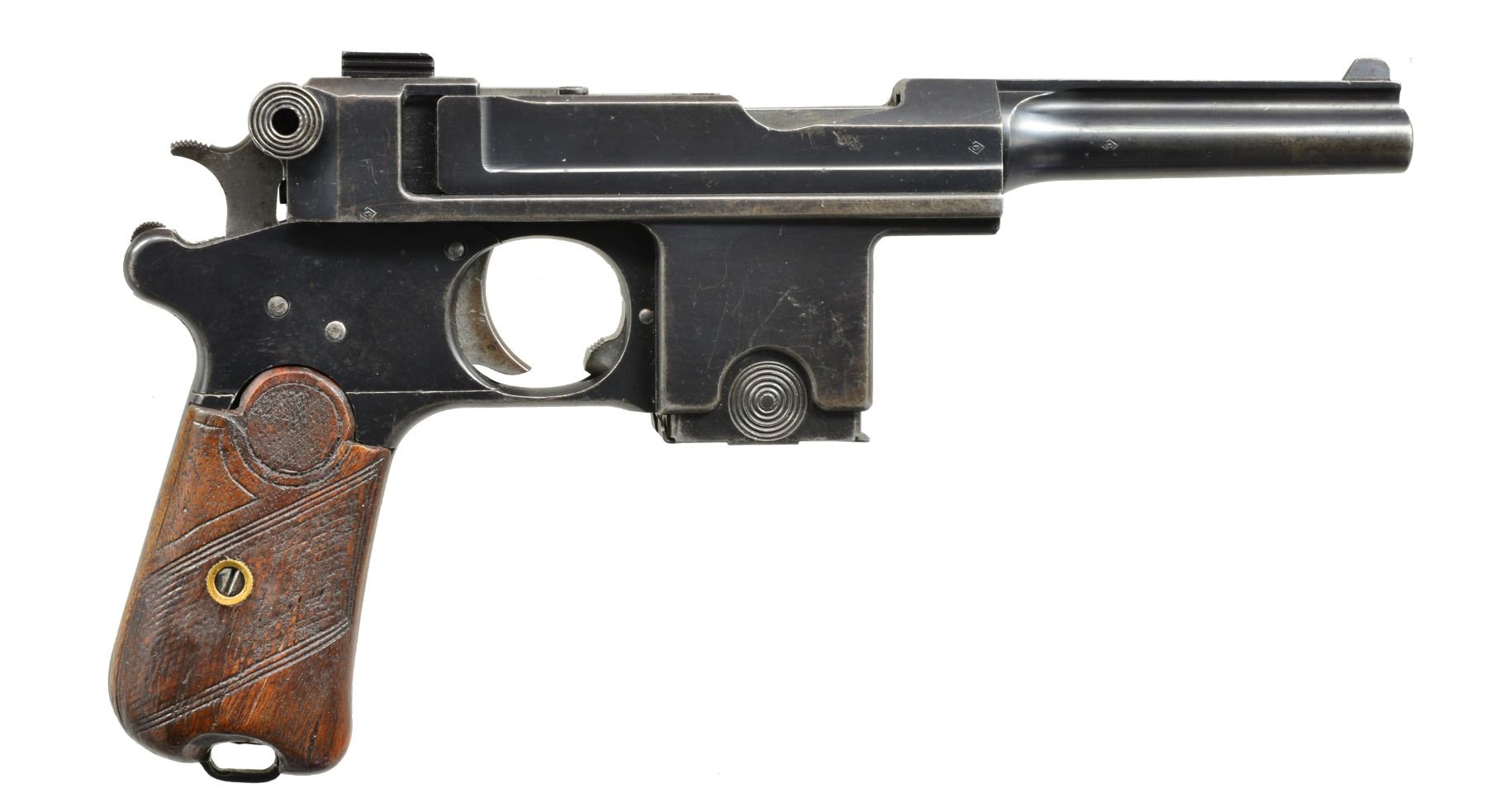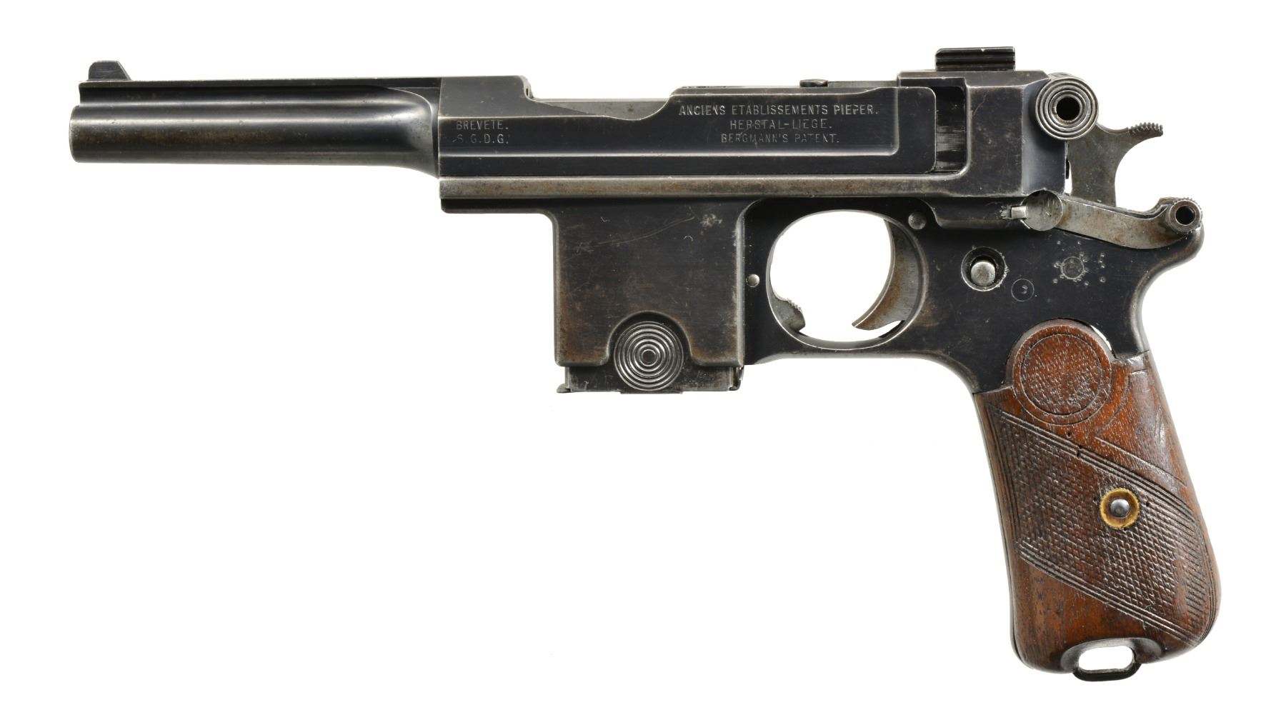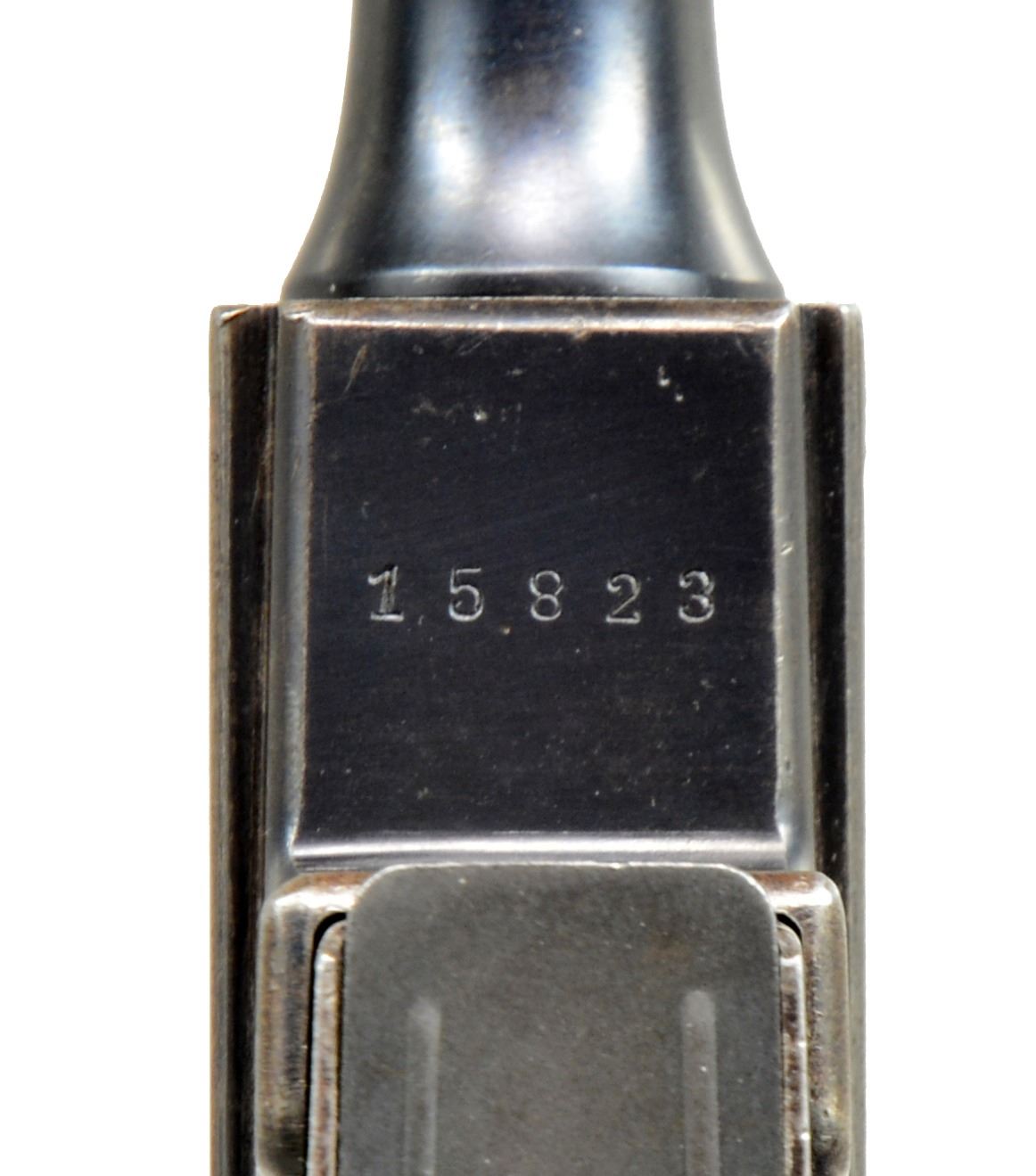 PISTOL. Cal. 9mm Largo. S# 15823. Bbl. 4" w/ blade front sight & fixed V notch on takedown. Initially mfg. for Denmark in serial range 6,000 to 11,000; 4,840 units. Improved version of Model 1908 w/ minor modifications to include distinctive 'S' shaped mainspring. Push button sideplate release. After Danish order, Germans ordered 2,000 that were numbered 15,000 to 16,999; produced w/out Belgian proofs. Open diamond having "C" inside for proofs. Chambering is more powerful than 9mm Luger & correctly titled 9x23mm Bergmann. Production ceased in 1914 but cleanup production occurred after WWI & numbered in 17,000 range. Grips are improved checkered walnut as Danish Trolit plastic grips were prone to cracking & chipping. Left front of bbl. extension marked " BREVETTE / S. G. D. G." left rear has Pieper markings. MAGS: 1 good plus 6 rd. numbered 1423; noticeable wear on spine plus portions of body. CONDITION: good to very good overall appearance having high point wear along w/ light marks & peppery oxidation. Left side of frame by hammer pivot w/ numerous punch marks as if to retain pivot. Receiver rails w/ some extra light pitting & wear. Grips have much hand wear & extra finish applied. Good appearing bore w/ light wear & frosting. (20-937/NW). CURIO. $2,000-3,000.