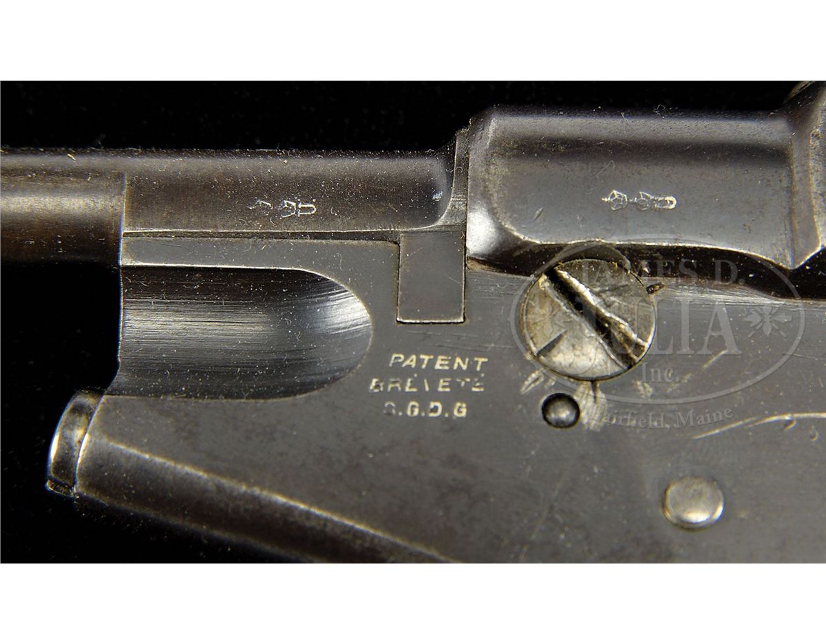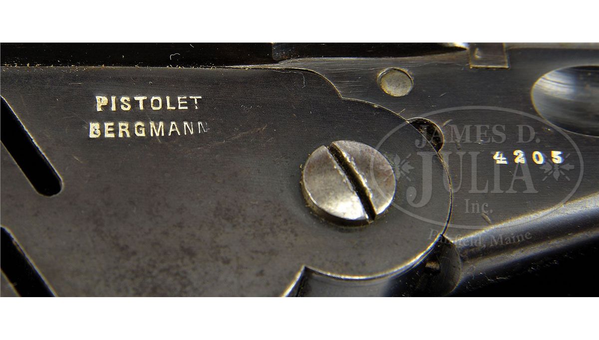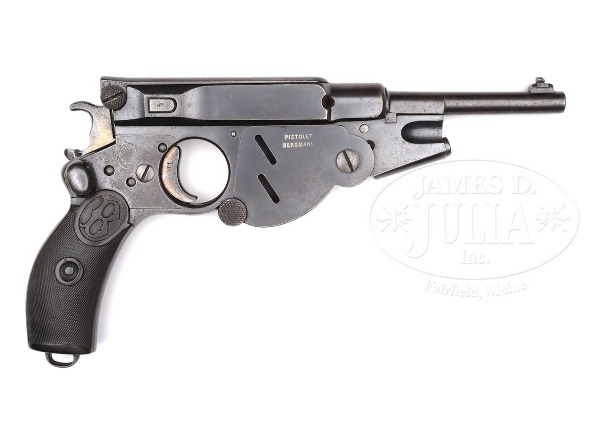 SN 4205. Caliber 6.5mm Bergmann. This is a late example of a M1896 #3 semiautomatic pistol as produced by the Bergmann company with extractor and contoured backstrap. Chambered for the 6.5mm Bergmann grooved cartridge. Theodor Bergman was an early pioneer in the development of European semiautomatic pistols in the late 1890s and early 1900s. His early models were of distinctive design and had a silhouette that would never be confused with a competitor. All of the Number 2s, 3s, and 4s, had an integral magazine that was loaded by rotating down the magazine sideplate and inserting a strip of cartridges from the side. This particular pistol has a 4.5" bbl, a dovetailed front sight and a fixed rear sight integral to the bolt that is afixed to a sliding cover over the ejection port. The unnumbered lugged bbl is marked with a Crown U that is repeated on the left side of the chamber. The left receiver, with short flutes, is marked "Patent Brevete S.G.D.G.". The serial number 4205 appears on the right side of the receiver, just below the flute. In the center of the sideplate, which has a staple for the shoulder stock, is the Bergmann factory logo featuring a miner surmounted by the words "Gaggenau" and over V.C.S. Suhl. In this case, V.C.S. were the initials for V. Charles Schilling, who made the pistols for Bergmann and Suhl, which was the location. "Pistolet Bergmann" is marked on the rotatable magazine cover. Hard rubber grips are molded with a large stylized "B" and finely checkered. PROVENANCE: Joseph J. Schroeder, Jr. Collection. CONDITION: Original finish, estimated at 60-70%, with more toning than actual wear. There is comparable or slightly more oxidative loss to the straw that was originally used to finish the hammer, safety retainer, and the trigger. Similar considerations apply to the fire blue loss on the safety lever. Original grips are slightly worn with blunted checkering but no chips or splits. Bright bore with sharp rifling and mild corrosion. Mechanically perfect. 4-48525 LMA52