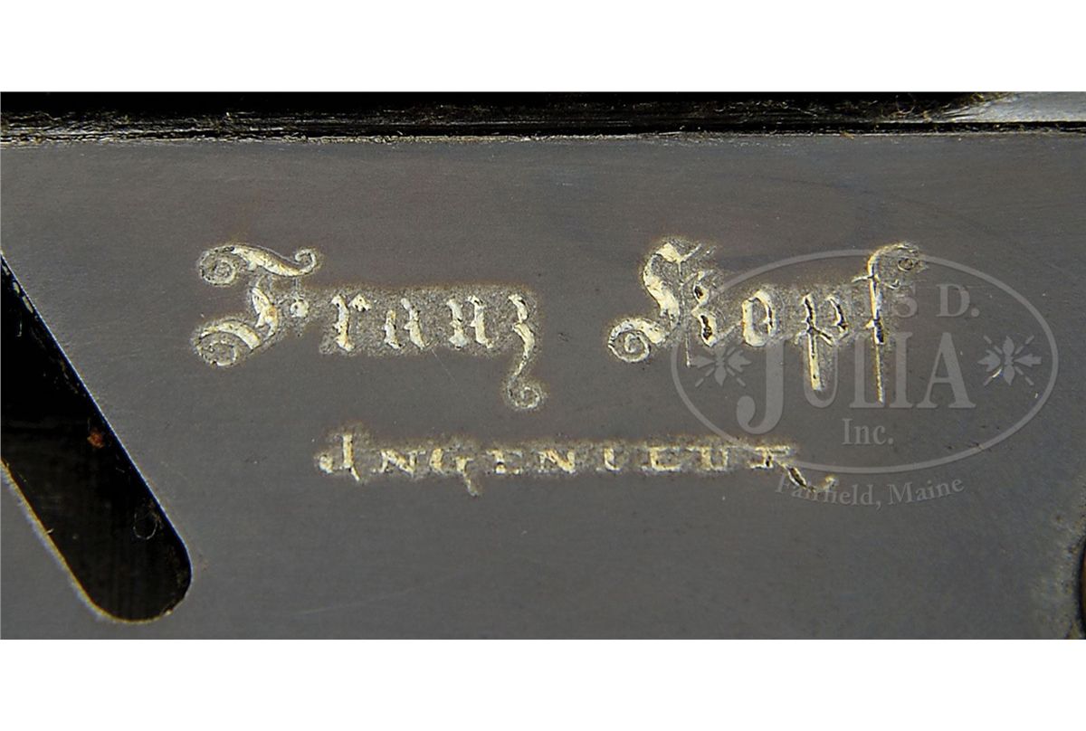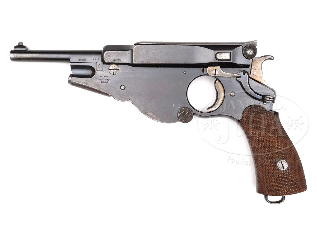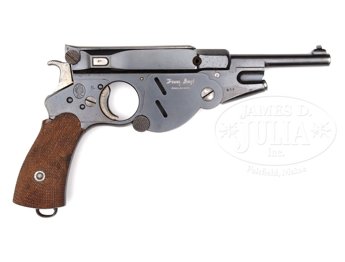 SN 416. This is an early example of a M1896 #3 semiautomatic pistol as produced by the Bergmann company without extractor and a narrow backstrap. Chambered for the 6.5mm Bergmann grooveless, rimless cartridge. Theodor Bergman was an early pioneer in the development of European semiautomatic pistols in the late 1890s and early 1900s. His early models were of distinctive design and had a silhouette that would never be confused with a competitor. All of the Number 2s, 3s, and 4s, had an integral magazine that was loaded by rotating down the magazine sideplate and inserting a strip of cartridges from the side. This particular pistol with an octagonal chamber has a 4.5" bbl, a dovetailed front sight and a fixed rear sight integral to the bolt that is afixed to a sliding cover over the ejection port. The lugged bbl is marked 278 on the left side. Adjacent to this number is a large #8 (corresponds to the takedown sequence) and a Crown U marking that is repeated on the left side of the chamber. The left receiver, with short flutes, is marked "Patent Brevete S.G.D.G.". The serial number 416 appears on the right side of the receiver, just below the flute. In the center of the sideplate is the Bergmann factory logo featuring a miner surmounted by the words "Gaggenau" and over V.C.S. Suhl. In this case, V.C.S. were the initials for V. Charles Schilling, who made the pistols for Bergmann and Suhl, which was the location. The large #9 corresponds to the takedown sequence. This particular pistol was a special order for "Franz Kopf, Ingenieur" whose name and profession are inscribed on the rotatable sideplate. The front face of the trigger is checkered and the gun was fitted with special target-type walnut grips that had a standard checkering pattern and customary escutcheons. PROVENANCE: Joseph J. Schroeder, Jr. Collection. CONDITION: Original finish, estimated at 80%, with more toning than actual wear, particularly on the left side. There is comparable oxidative loss to the straw on the hammer, safety retainer, and the trigger. Similar considerations apply to the fire blue loss on the safety lever. Crisply checkered grips showing minimal handling. Bright bore with sharp rifling and mild corrosion. Mechanically perfect. Very few #3s were made with an octagonal chamber, all clustered around the 400 serial range. To find one of these guns with special order features is an extraordinary discovery. 4-48519 LMA54
