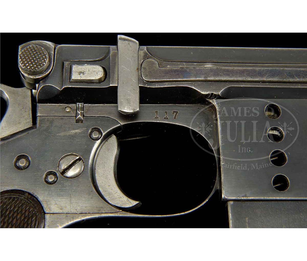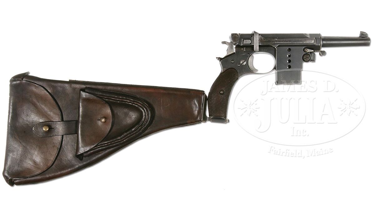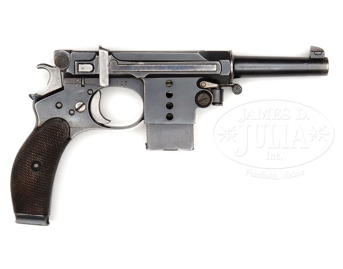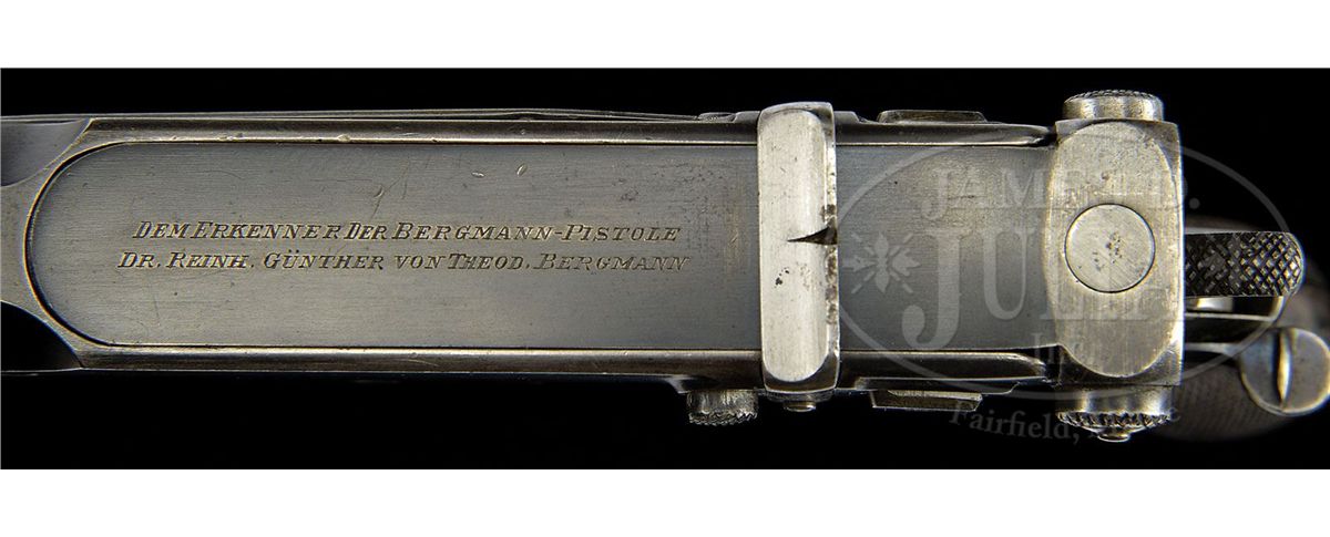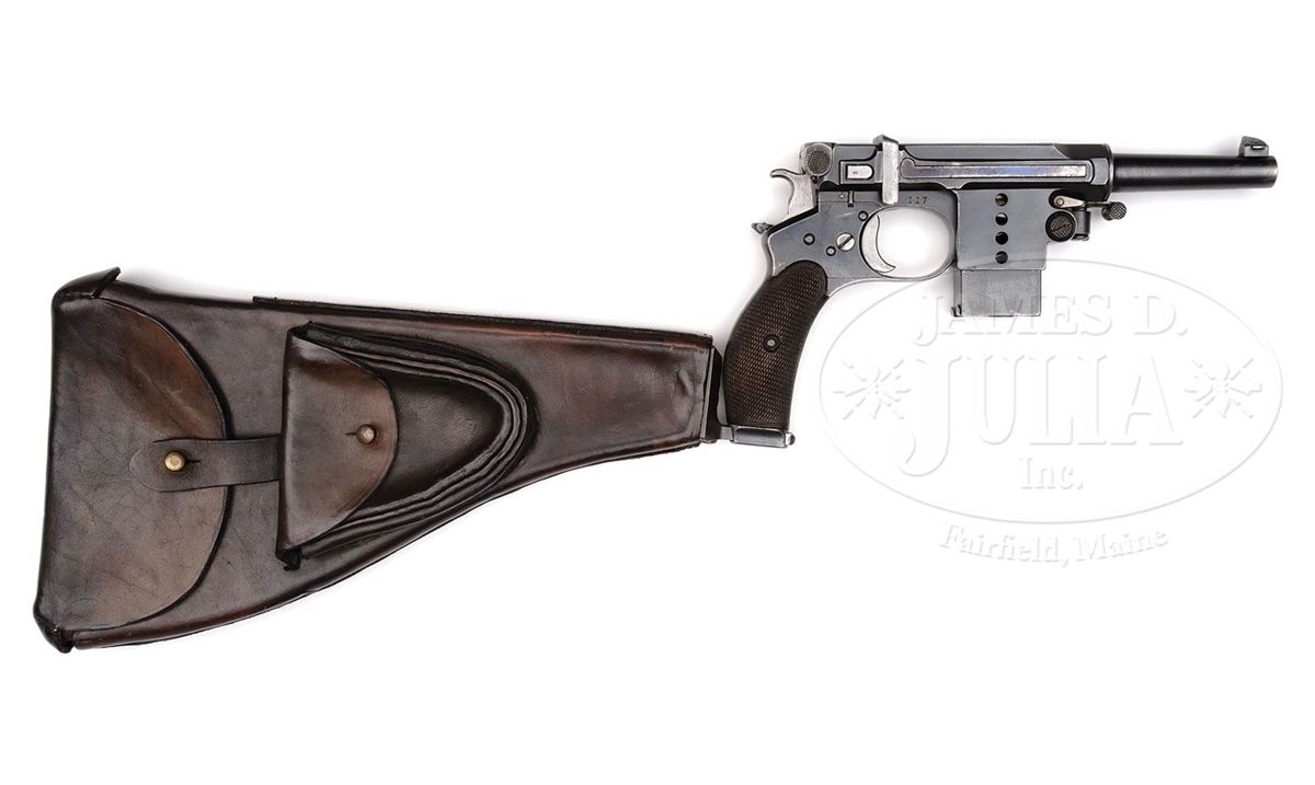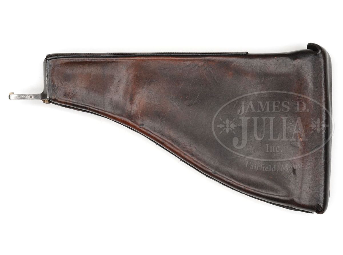 SN 117. Cal. 7.8mm. Bergmann made approximately 1,000 M1897s. During its production there ensued a number of variations, largely directed to the milling pattern of the right frame. Compare this gun to the M1897, serial number 156, elsewhere in this auction. Most were sold with a leather covered shoulder stock that was often "lost" over the years. This example has a 3" bbl whose shroud is affixed with a drift adjustable front sight. The rear sight is graded from 100-1000 meters with gradations of 1,3,5,7,9,1000. As is typical for the numbered Bergmann pistols, a sliding cover is attached to the bolt. In this case, the cover is inscribed with "DEM ERKENNER DER BERGMANN-PISTOLE DR. REINH. GUNTHER VON THEOD. BERGMANN". According to the consignor, the inscription was from the inventor Theodor Bergmann to Dr. Gunther, his agent in Switzerland, for promoting the pistol in Swiss trials. The left side of the frame was marked with a Crown/Crown/U while the right side of the frame was marked with the serial number 117 that is repeated on the bottom of the magazine. Each side of the magazine well is drilled with four visualization holes. Normally, the M1897 will have a strawed hammer, safety stop, trigger and bbl shroud lever while the extractor sight bar and safety are fired blue. Wood grips are finely checkered with a thin border. The matching stock has a color case hardened lug numbered to the pistol and retained by two fired blued screws. The spare pouch on the right side of the stock is empty and there is no cleaning rod in the provision along the spine. The lid is secured by a single brass stud that extends from the flap. PROVENANCE: Dr. Geoffrey Sturgess Collection, ex Visser collection, illustrated in Sturgess "The Borchardt and Luger Automatic Pistols". CONDITION: Approximately 90-95% original blue with muzzle and sharp edge wear. Backstrap is thin, showing evidence of cleaning. Many of the small parts have lost their heat treated colors and now appear gray, namely the front sight, hammer, sight bar, safety stop, and trigger. Remnants of straw remain of the shroud locking lever. About 70% fire blue remains on the safety. Original grips with blunted checkering and staining consistent with the condition of the pistol and magazine. The bolt return spring is sluggish, requiring an assist for full closure. Mechanics otherwise perfect. Matching stock with brown smooth leather body showing minimal crazing and good flexibility. The leather smell is strong and the body/flaps supple, probably recovered a long time ago. Approximately 80-90% of the case hardening remains on the matched lug. Overall, an exceptional M1897 Bergmann rig with a historic presentation association. 4-52046 LMA101