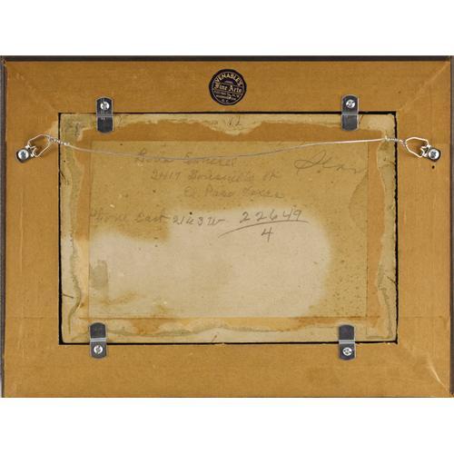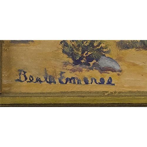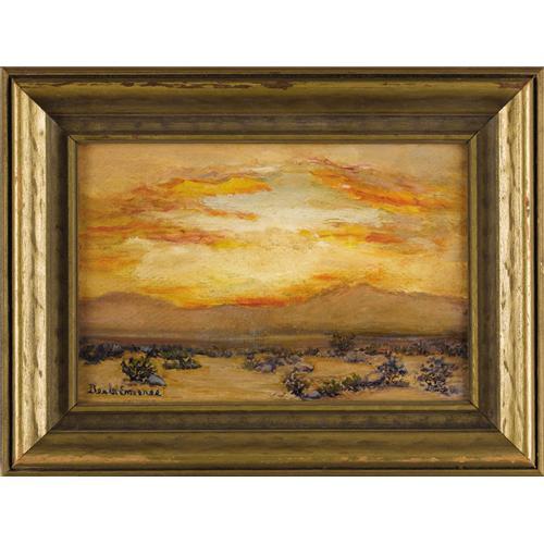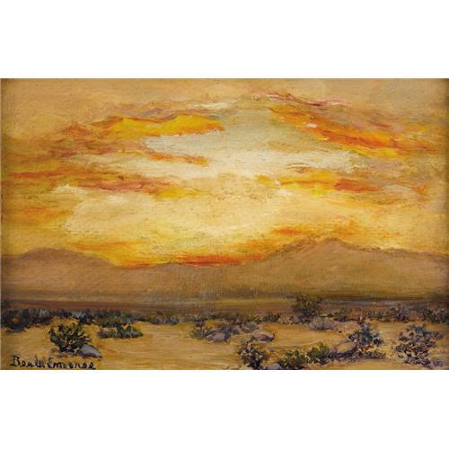 <B>BERLA EMEREE (1899-1948)</B></I><BR>Untitled Sunset<BR>Oil on artist board<BR>7in. x 10 3/8in.<BR>Signed lower left<BR>Signed verso<BR><BR>A vibrant scene of the setting sun over the desert mountains.<BR><BR>A letter of provenance from the artist is included with the lot.<BR><BR>Provenance:<BR>Mr. & Mrs. Everett A.R. Searl<BR>Don Kipp<BR><BR>Label verso:<BR>Venable's Fine Arts, Washington, D.C.<BR><BR> <B>Condition Report:</B> Excellent condition with minor inpainting to center of painting in the clouds. Period frame in excellent condition.<BR><BR><b>Shipping:</b> Requires 3rd Party Shipping (<a target="_blank" href="http://www.heritageauctions.com/common/shipping.php">view shipping information</a>)