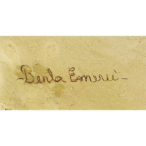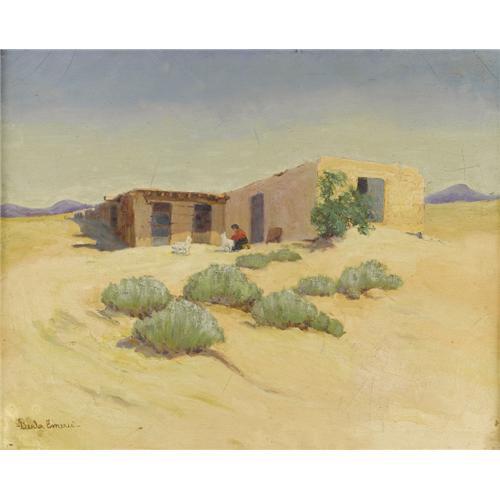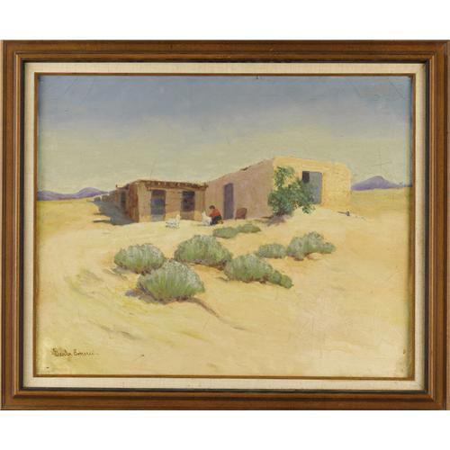 <B>BERLA EMEREE (1899-1948)</B></I><BR><I>New Mexico Adobe</B></I><BR>Oil on canvas<BR>24in. x 30in.<BR>Signed lower right<BR>Signed and titled verso<BR><BR>A long time resident of El Paso, Berla Emeree studied art in Philadelphia with Frank Ashley Linton and Michael Jacobs. In Texas she studied with Jose Arpa, Xavier Gonzalez, and Rolla Taylor. Known for her adventurous spirit, Emeree was fearless in traveling alone in her car, camping out in the open in often dangerous areas. She was known to finance her adventures by trading her paintings for gasoline or food.<BR><BR>This painting is inscribed: <I>This was accepted at a big exhibition in San Antonio, Texas given by a big oil man. They wired Berla to come to the banquet and she went.</B></I><BR><BR>A letter of provenance from the artist is included with the lot.<BR><BR>Provenance:<BR>Mr. & Mrs. Everett A.R. Searl<BR>Don Kipp<BR><BR>Exhibited:<BR>Reminent of Exhibition Sticker (attached verso)<BR><BR> <B>Condition Report:</B> Excellent condition. Period frame in excellent condition.<BR><BR><b>Shipping:</b> Requires 3rd Party Shipping (<a target="_blank" href="http://www.heritageauctions.com/common/shipping.php">view shipping information</a>)