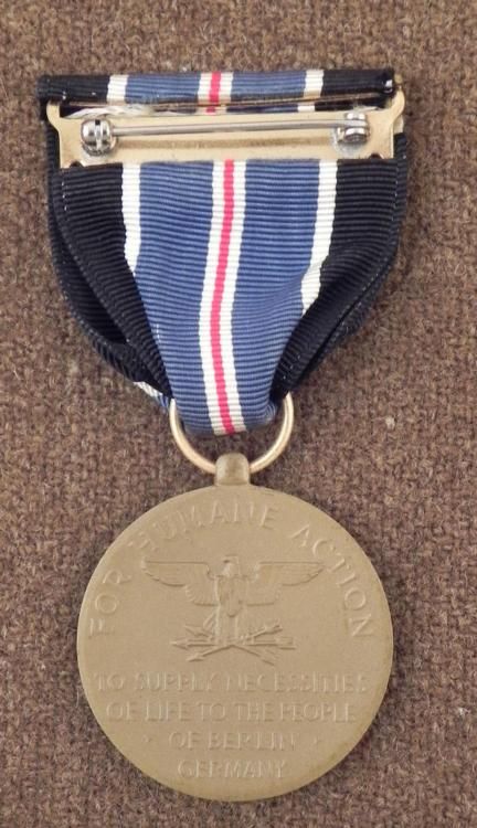HERE IS A BERLIN AIRLIFT MEDAL, MOUNTED ON RIBBON WITH PIN. THE MEDAL SHOWS A PLANE WITH WREATH ON FRONT AND ON THE REVERSE IT READS FOR HUMANE ACTION-TO SUPPLY NECESSITIES OF LIFE TO THE PEOPLE OF BERLIN GERMANY. *