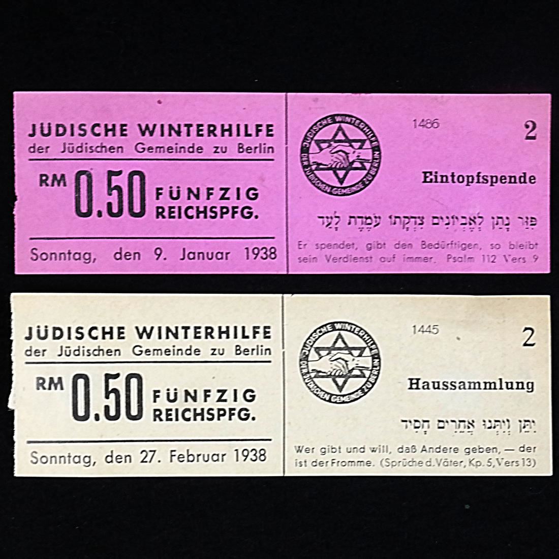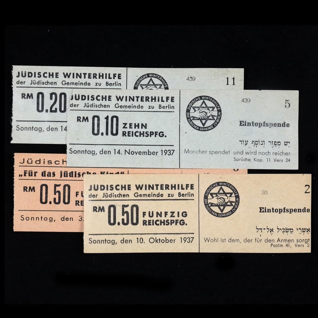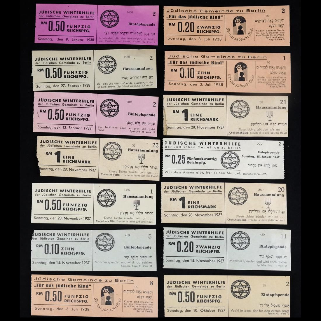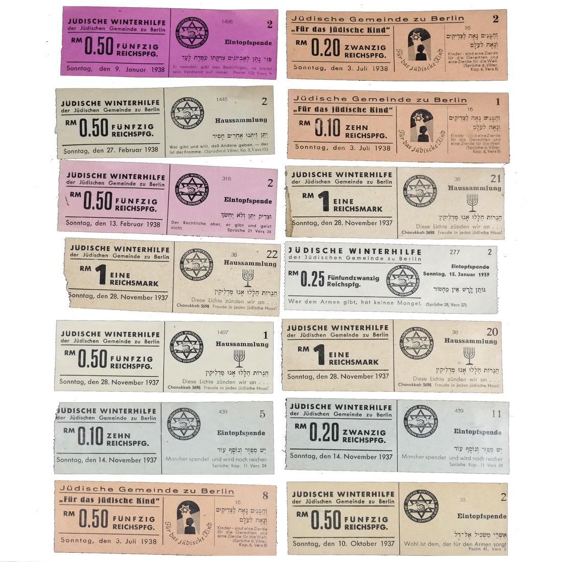 Includes 10pf, 25pf, 50pf and 1M coupons with dates from 1937 through 1939, and on different colored papers and for different purposes (house collection, feeding, for children), generally sound and VF-XF.