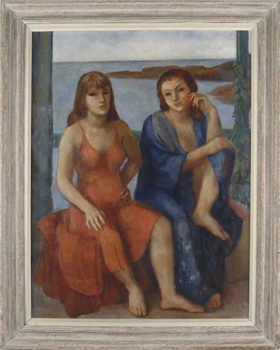 BERNARD KARFIOL (American, 1886-1952) "RESTING". Large oil on canvas scene shows two women seated on porch overlooking water with rocks. One wears a red dress, the other a blue robe. Signed lower left "B Karfiol". Housed in its original white washed weathered frame with white liner. The back stretcher has title and dated 1935. A partial exhibit label and marked 59. SIZE: 40" x 30". CONDITION: Very good. 9-27755
