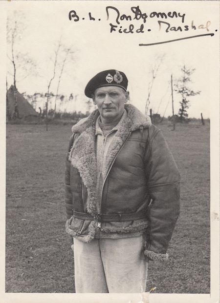 (1887 - 1976) British Field Marshall who commenced the drive at El Alamein that ultimately drove Rommel from North Africa. Also involved in the invasions of Sicily and France. Probable war-date s.p. "B. L. Montgomery Field-Marshal", 4 1/2" x 6 1/2" b/w, shows Monty three-quarter length in sheepsking jacket and trademark beret, a tent set in the distance. Boldly signed, a small surface chip at bottom, else fine.