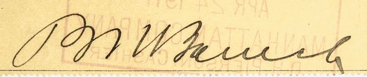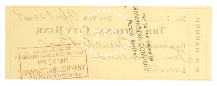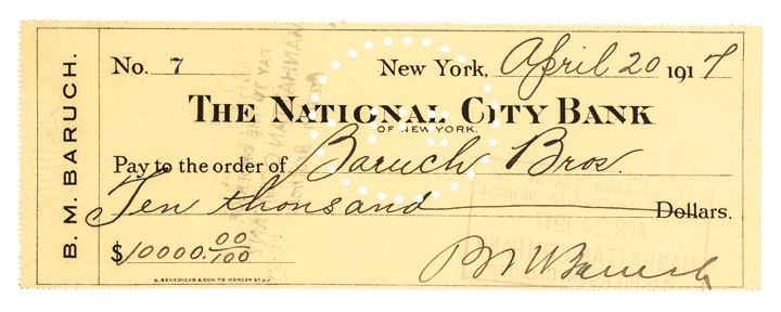 April 20, 1917-Dated, Autograph Document Signed, “Bernard M Baruch”, 7.5” x 2.75”, being a National City Bank of New York check. Check is made out for the sum of ten thousand dollars to the "Baruch Bros" with bank stamp on back.