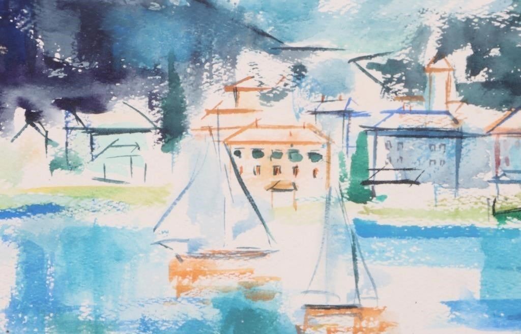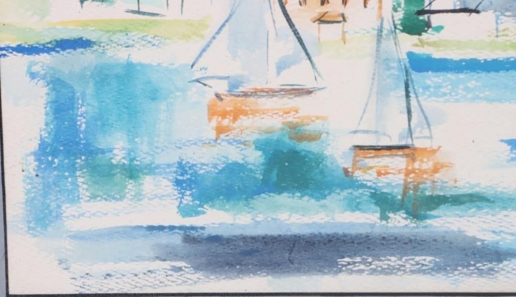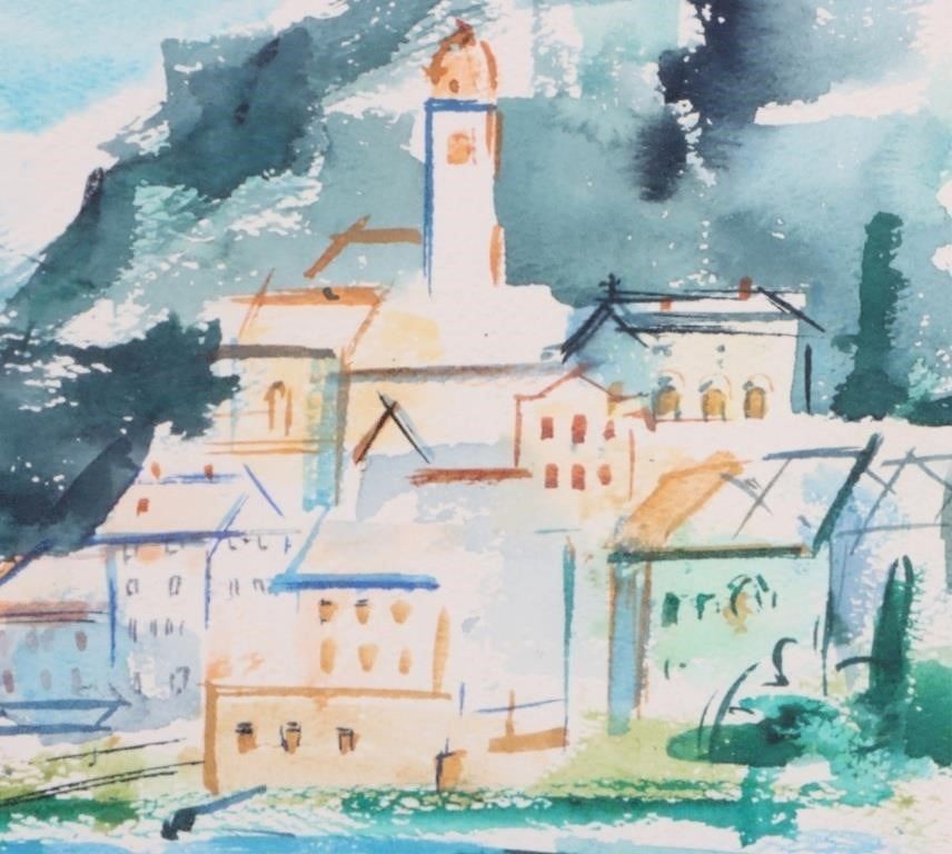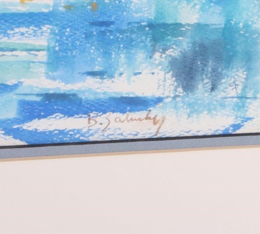 Bernard Zalusky (1921-1993, American) Watercolor and Marker landscape. Portraying an seaside town.