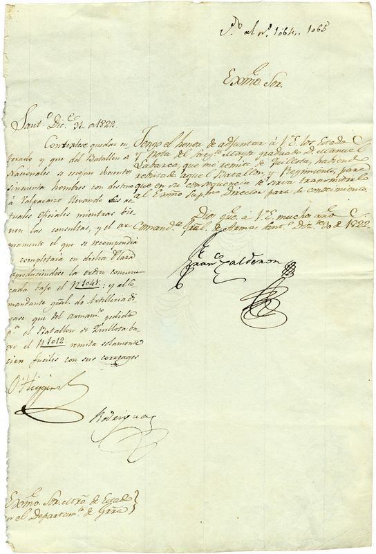 South American revolutionary and first Chilean head of state as "Supreme Director" (1817-23), commanding forces that won independence from Spain. DS "OHiggins R" in Spanish, 1p, 8½"x12½", Santiago, Dec 31, 1822. Untranslated. O'Higgins gives orders regarding some troops. Signed also by two others. Left edge uneven affecting few letters of text but does not touch strong signature. The reformed-minded director aroused opposition from the landowners, and he was deposed only 28 days after signing this document. Exiled to Peru, he remained there until his death.