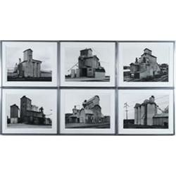 BERND & HILLA BECHER (German, b. 1931 & 1934) GRAIN ELEVATORS the first print in the series is signed by both photographers in pencil on verso of mount the first print is inscribed with a sequence map in pencil on verso of mount each print is inscribed with an "F" and the sequence number in pencil on verso of mount six vintage gelatin silver prints mounted on boards in artists' frames overall dimensions: 33 x 62 in. (83.8 x 157.5 cm) 1986 this work is unique ESTIMATE: $35,000-40,000 PROVENANCE Matthew Marks Gallery, NEW YORK Private Collection, PARIS EXHIBITION KAWASAKI CITY, Kawasaki City Museum, DISTANZ UND NÄHE, November 24, 1996-January 26, 1997 (traveled to Goethe Institute, TOKYO) NOTE: Top row, from left to right: Mount Cory, Ohio; Lowell, Indiana; Joliet, Illinois; Bottom row, from left to right: Scirleville, Illinois (although this is the location listed in the exhibition catalogue, the correct location is most likely Scircleville, Indiana); Delphos, Ohio; Clifton, Illinois