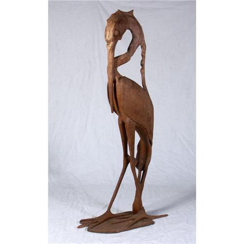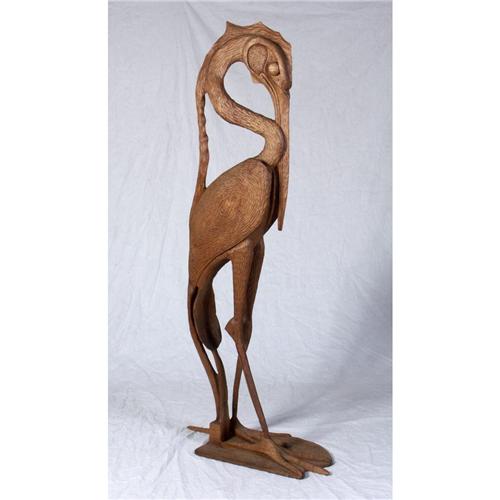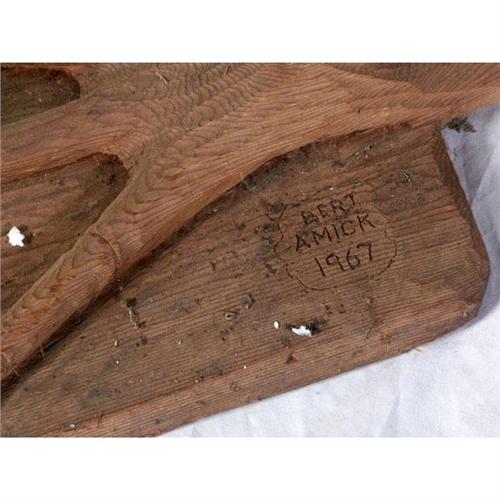 CARVING: Carved cedar crane sculpture, incised siganture at base reads ''Bert Amick 1967'', note open portion at body cavity, repair at leg. 84'' H