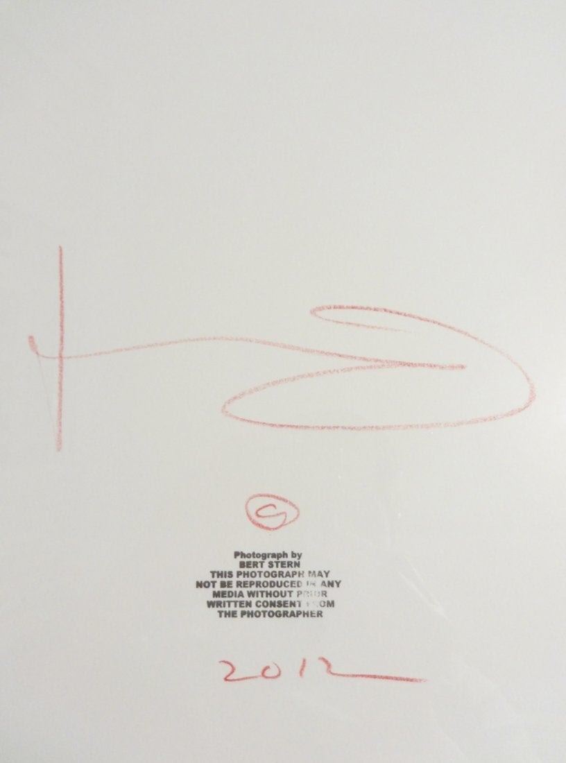 Title: Marilyn Monroe looking at you. Signed by the world famous photographer Bert Stern 1929-2013 in real gold plated. Bert Signed Marilyn, and signed his signature along the bottom of the image . Copyright stamped by Bert Stern on the back. Professionally mounted and framed in Gallery white wood, with pvc coating. Glassed on the back so the stamp can be seen. Supplied with Bert Stern's coa.