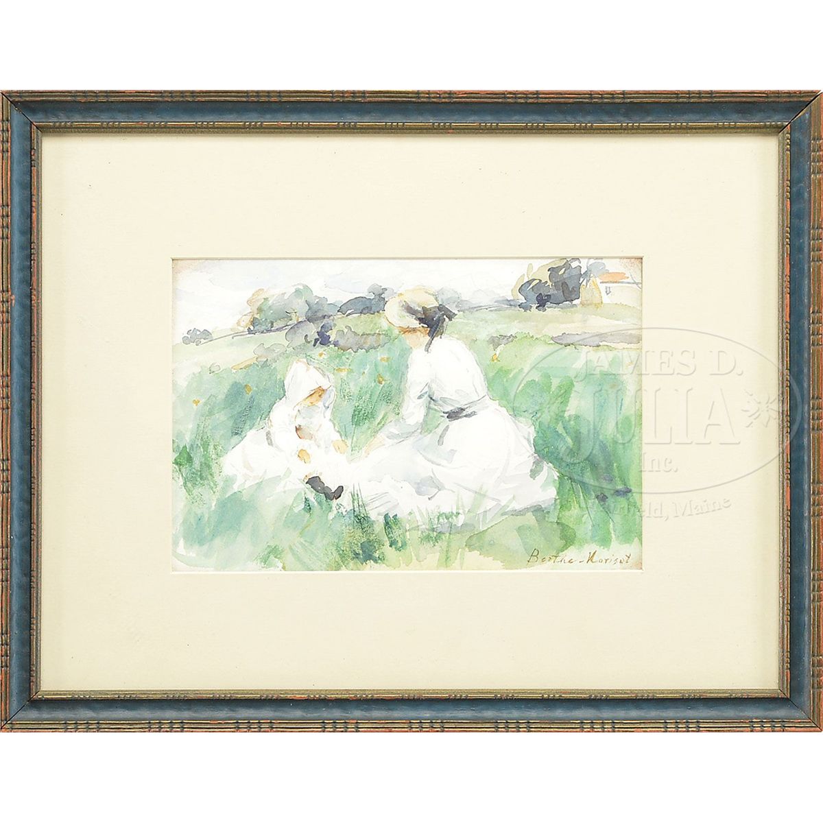 Watercolor on paper Housed in a decorated wood frame with ivory matte Signed lower right "Berthe Morisot" SIZE: Sight: 6" x 9". Overall: 12-1/4" x 15-3/4". PROVENANCE: Copy of original certificate dated 2003 from Gallerie B.L. accompanies lot. CONDITION: Very good. 9-29419