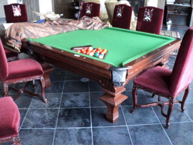 WOOD: MAHOGANY, FINISH: PIANO FINISH ENTIRE TABLE, STAIN: BROWN MAHOGANY, RAILS: SNOOKER, SET FOR 2.125" BALLS, POCKETS: BLACK CARVED POCKET W/ CARVED SHIELDS, SLATE: 5 X 10 X 1", PAID: $ 32,500.00 {print sequence:} 369