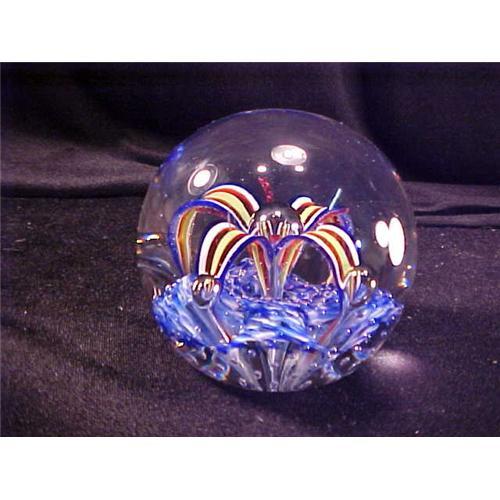 THIS IS A STUNNING PIECE OF ART GLASS. THERE IS A BLUE, CHARTREUSE, PINK AND WHITE STRIPED FLOWER WITH SWIRLS OF BLUE GLASS TO HIGHLIGHT. THE PAPERWEIGHT MEASURES 3 1/2" IN DIAMETER. IT WAS PURCHASED IN 1937, AS DOCUMENTED BY THE ORIGINAL OWNER WHO TAPED A PIECE OF PAPER TO THE BOTTOM WITH THE DATE HAND WRITTEN. THERE WAS A LARGER PIECE OF PAPER ALSO TAPED TO THIS PAPERWEIGHT STATING THAT THE MAKER WAS BESSIE AND SHERMAN, ALTHOUGH THE PIECE IS NOT MARKED. THERE ARE SLIGHT SURFACE IMPERFECTIONS AS WOULD BE EXPECTED FOR SOMETHING OF THIS AGE, EASILY BUFFED OUT.
