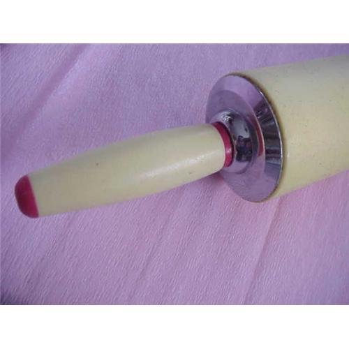 The best Art deco style rolling pin you will ever find! This is just fabulous! A sunshine yellow with a soft spongy rubber like finish enhanced with shiny chrome end decorations. The rolling pin is in very nice condition, no problems or damage. It displays beautifully! What a great find for the kitchen and your rolling pin collection! If you enjoy fine antique and vintage linens and lace, Shabby chic, Romantic cottage decor you may wish to book mark our site, since we list almost on a daily basis.