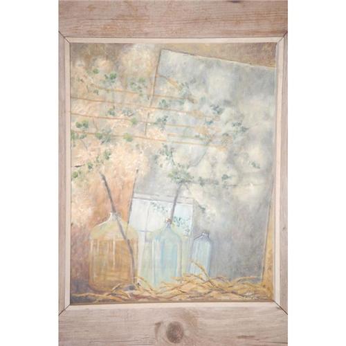 BETH COAR FERGUSON OIL ON ARTISTS BOARD STILL LIFE OF CUTTINGS ROOTING IN DEMIJOHN BOTTLES BY A TILTED WINDOW-TITLED "SMOKEBUSH REFLECTIONS" & SIGNED ON BACK IN A BARN BOARD FRAME (19 1/2" X 15 1/2") - WEAR & SOILING