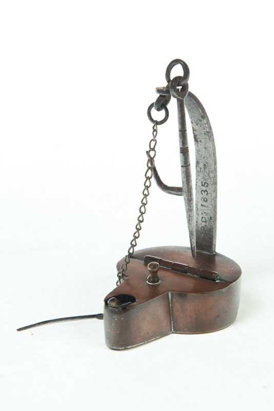 American. Stamped "PD 1835" for Peter Derr (Berks County, Pennsylvania). Copper and wrought iron with hanger and wick pick. 6 1/2"h.